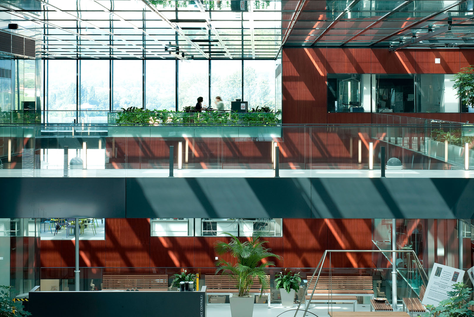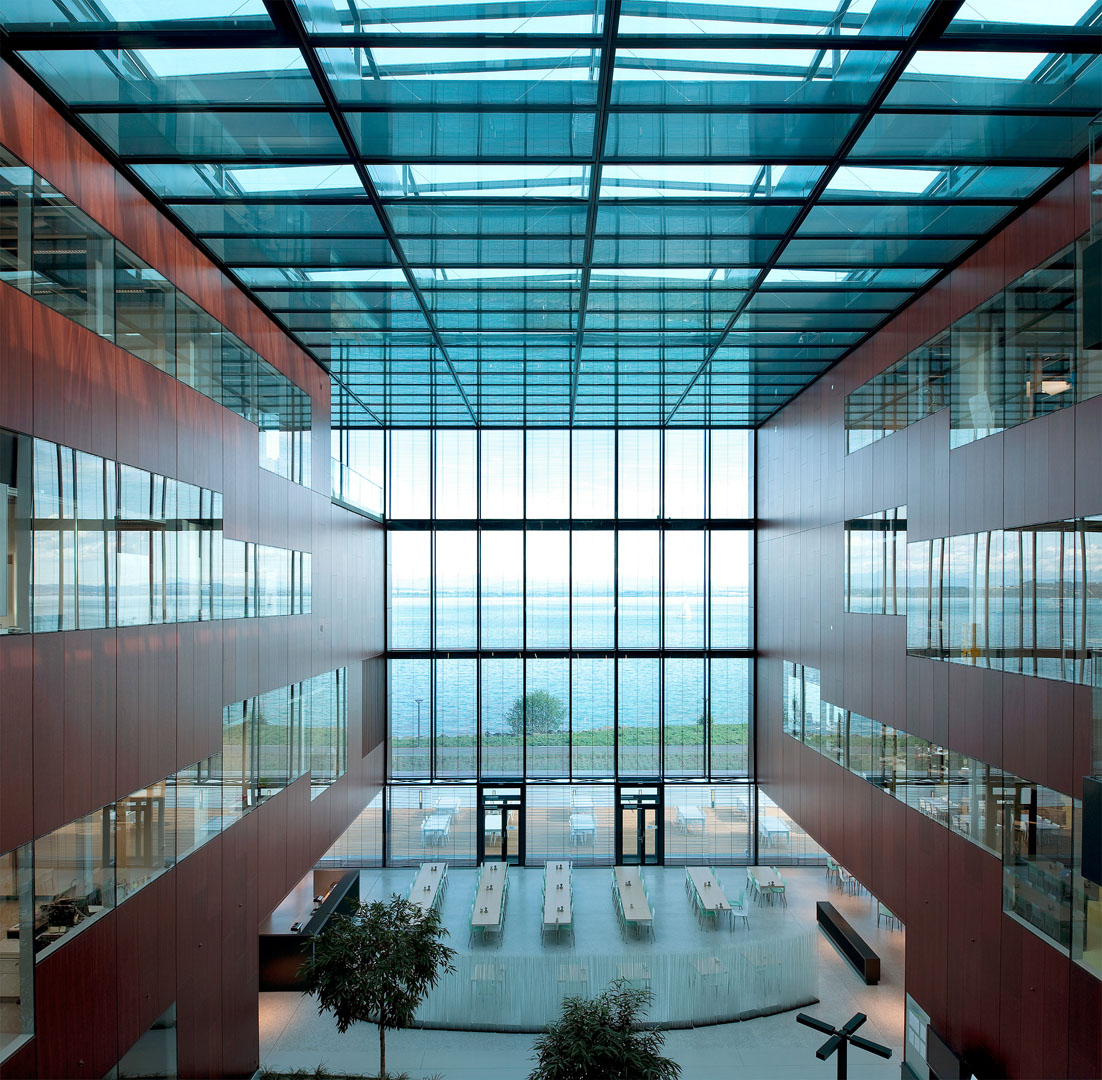Tri krila zgrade definišu laboratorije, kancelarije i prostor za isporuku. Između ovih krila, veliki atrijumi nude prostore sa spektakularnim pogledom na jezero sa različitih nivoa mostova koji ih prelaze.