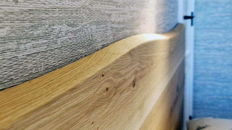 U ovom slučaju, za izradu uzglavlja kreveta korišćeno je drvo hrasta debljine 25 milimetara sa prirodnom gornjom ivicom, dok su ostale tri stranice ravne.