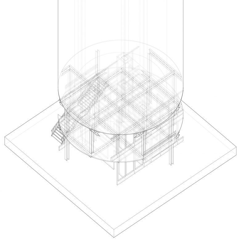 Sam eksponat sastoji se iz kružne baze koja je izrađena od laserski sečenih i sklopljenih komada translucentnog klirita, koja u proporciji predstavlja hirurški izvađen uzorak postojećeg kompleksa (i svu njegovu krhkost), kao i zamišljenog volumena “teške” praznine iznad njega u visini od dodatnih deset spratova.