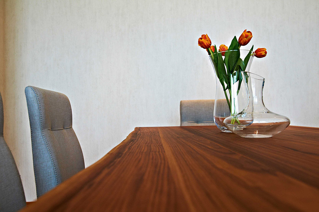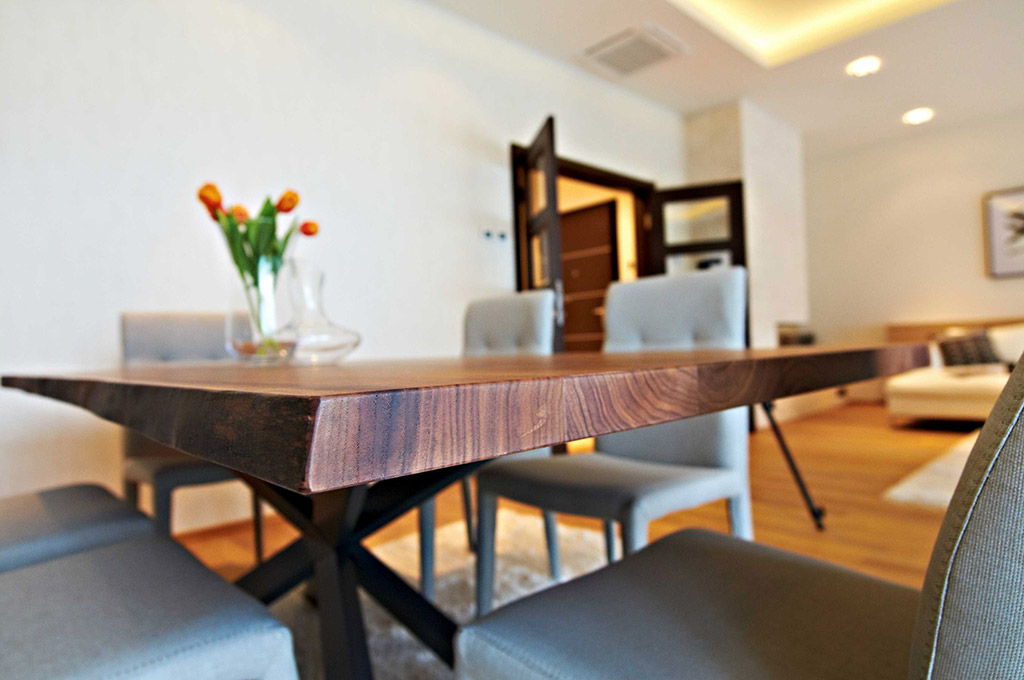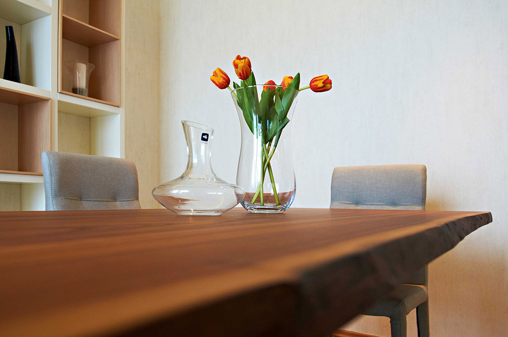 Trpezarijom dominira veliki sto dimenzija 200×100 centimetara za šest osoba. Ploča stola izvedena je od punog orahovog drveta a zanimljiv detalj su njegove talasaste ivice koje prate strukturu godova. Za stolom je postavljeno šest tapaciranih stolica sive boje. Ova nijanse sive pojavljuje se i na zavesi kao i na višem delu plafona. U sklopu centralno postavljenje otvorene police izvedena je i maska radijatora.