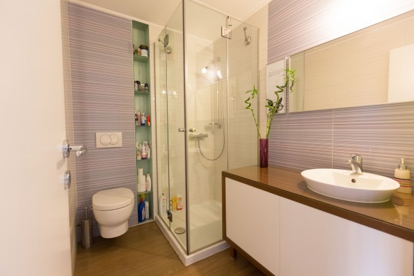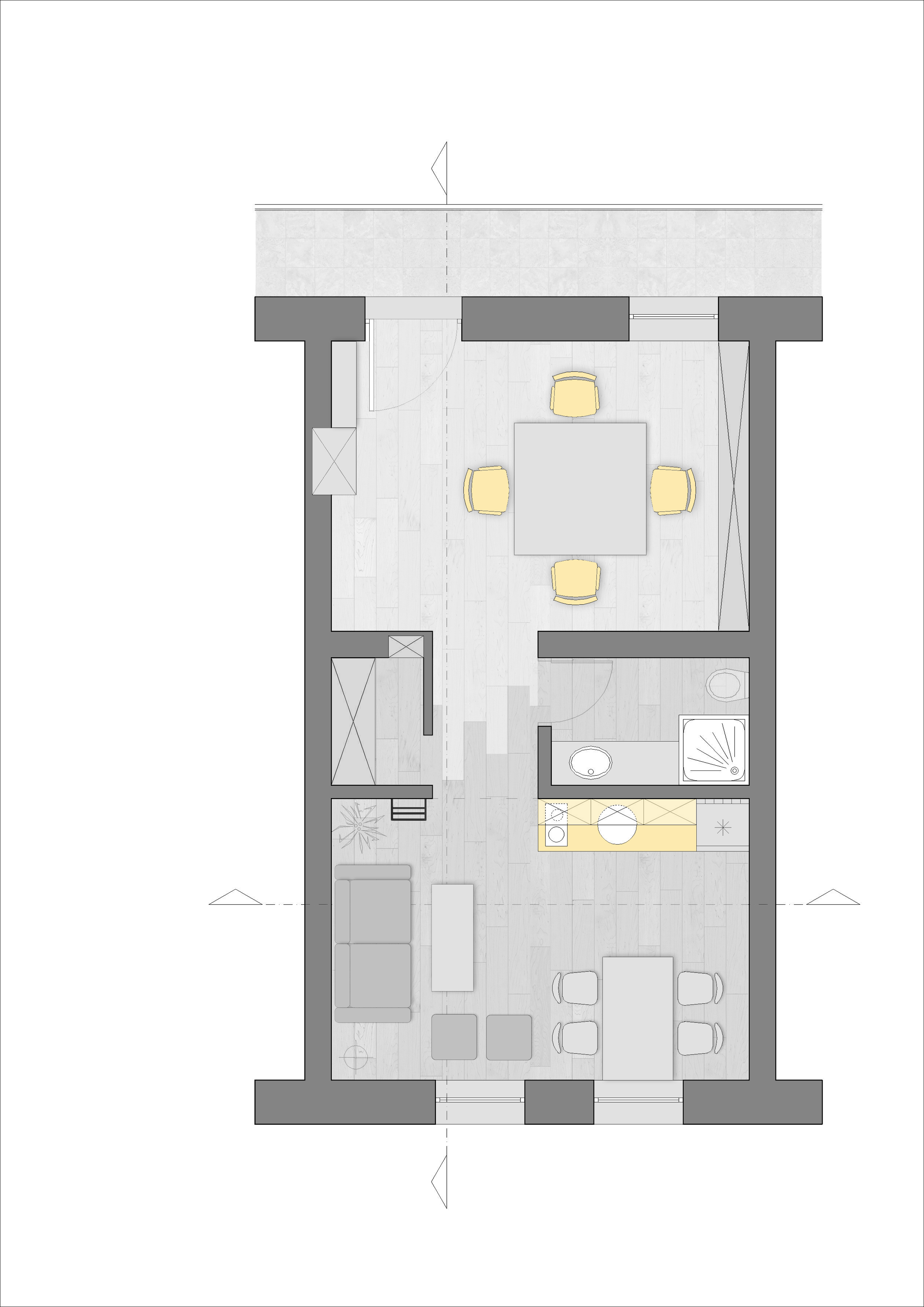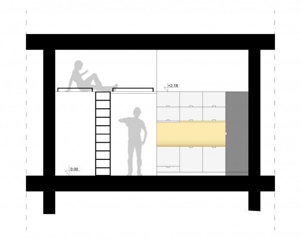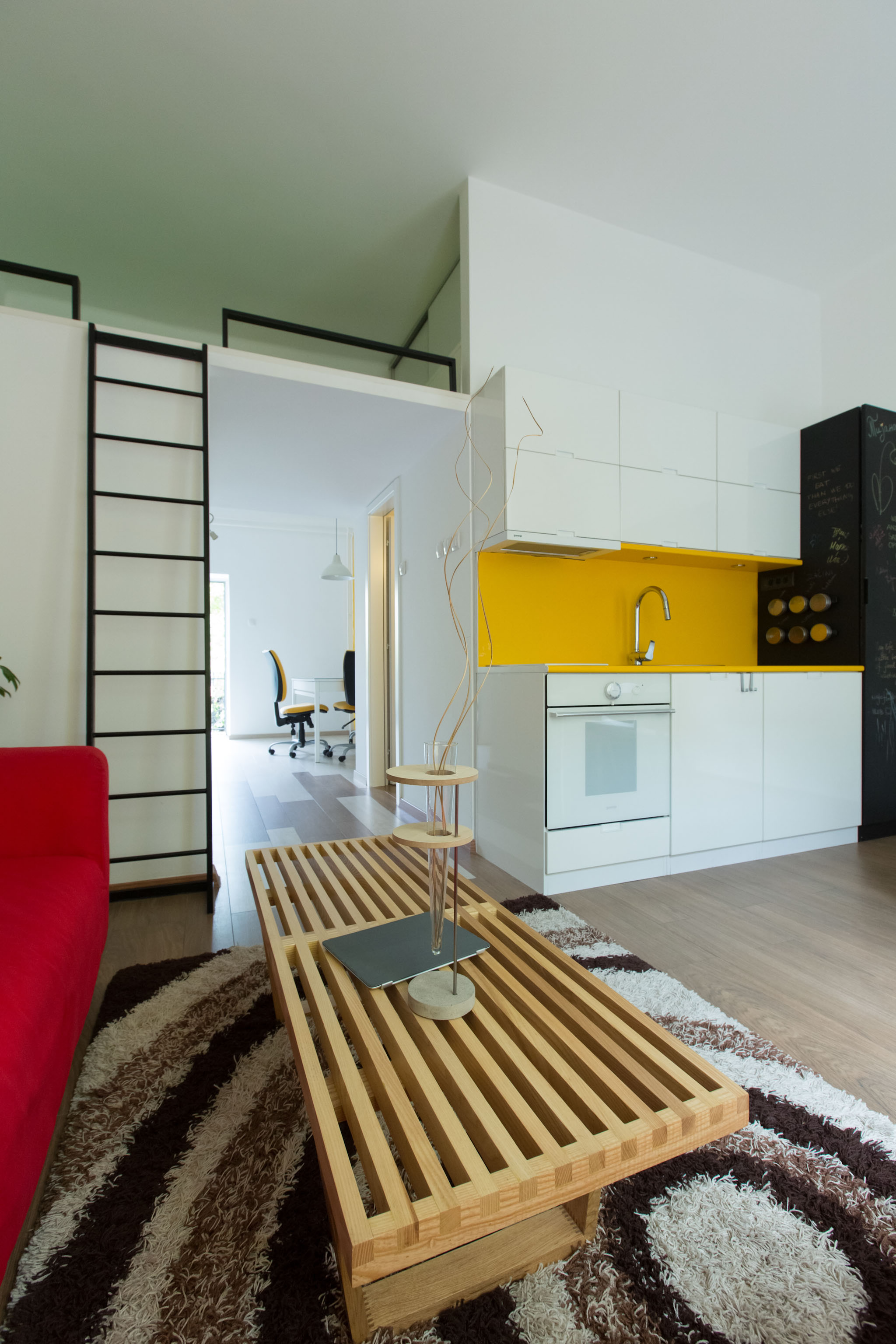 Enterijersko rešenje stana sadrži motiv „stana u stanu“ gde je ulazna prostorija organizovana kao studio za rad, dok je drugi deo stana oblikovan kao garsonjera sa svim potrebnim elementima za život.