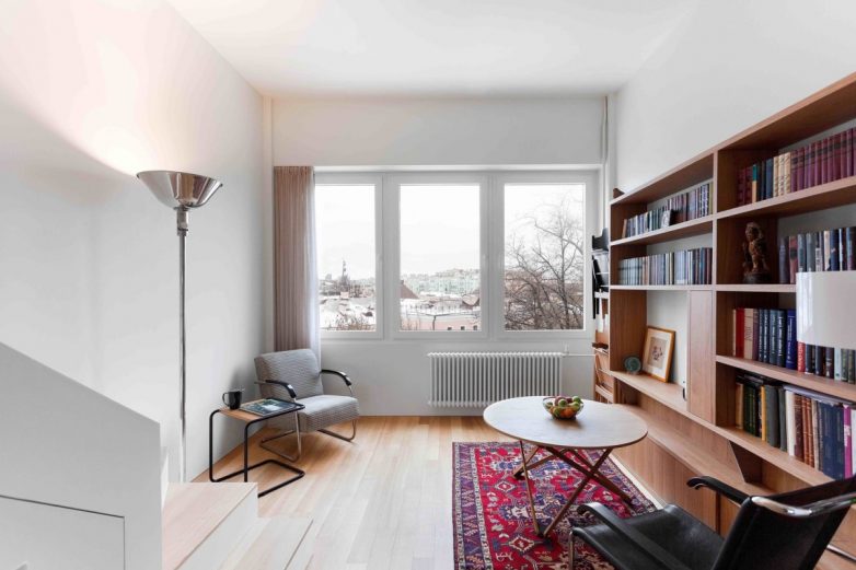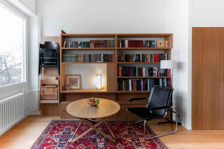 Najzanimljivije rešenje urađeno je duž centralnog zida gde je napravljen orman iza kojeg se krije ne samo mesto za skladištenje, već i cela kuhinja. Kada se sprema večera, kuhinja je eksponirana a kada neko dođe u posetu, ona može da se zatvori kako bi se dobio jednoobrazan, vizuelno neremećen, prostor.