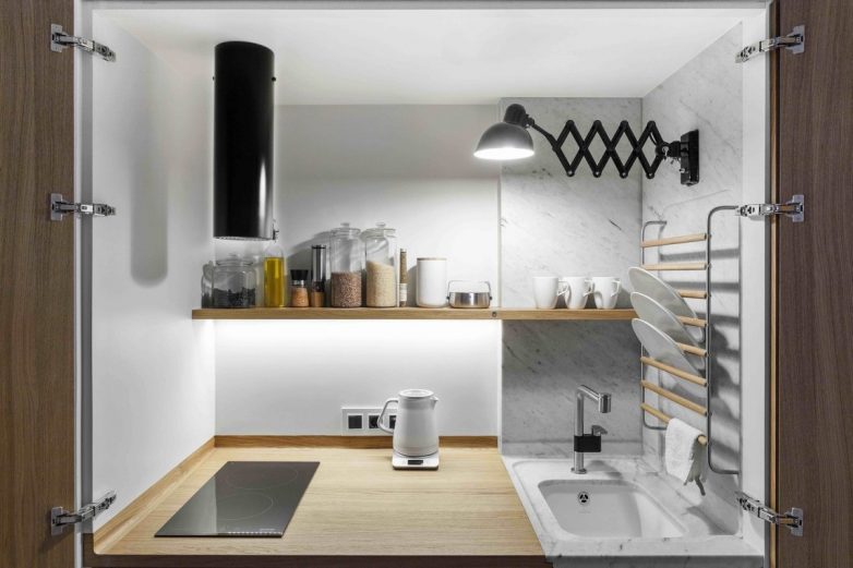 U plakar je smeštena cela kuhinja zajedno sa šporetom, frižiderom, mašinom za sudove pa čak i sto na izvlačenje.