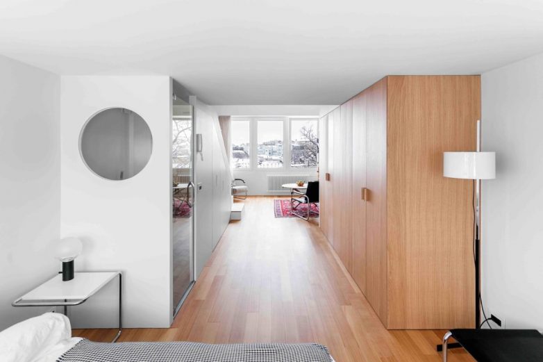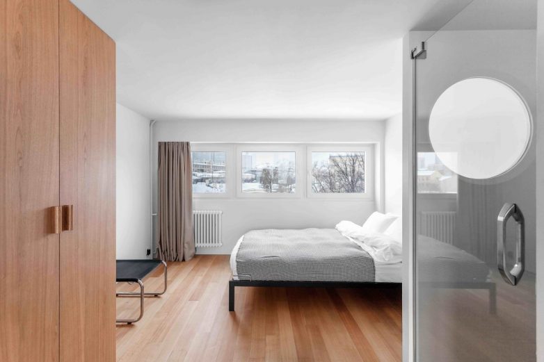 Dnevna zona odvojena je od spavaćeg bloka i kupatila zavesom koja atmosferu čini intimnijom i udobnijom. Spavaća soba je jednostavna i moderna, a interesantan je detalj kružnog prozora koje omogućava gledanje na ulicu za vreme tuširanja. Prirodno svetlo dolazi i preko staklenih vrata.