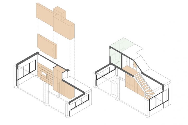 Najzanimljivije rešenje urađeno je duž centralnog zida gde je napravljen orman iza kojeg se krije ne samo mesto za skladištenje, već i cela kuhinja. Kada se sprema večera, kuhinja je eksponirana a kada neko dođe u posetu, ona može da se zatvori kako bi se dobio jednoobrazan, vizuelno neremećen, prostor.