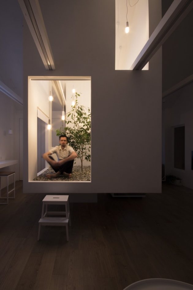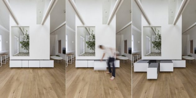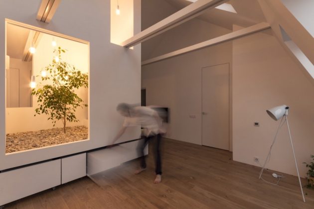 Suština ovog sjajnog potkrovlja ogleda se u centralno postavljenom volumenu koji je zapravo multifunkcionalni komad nameštaja sa brojnim neočekivanim rešenjima. Ideja je bila da se u jednom malom prostoru od 50 kvadrata napravi više zona koje će omogućiti da se on koristi i kao dnevni boravak, i kao spavaća soba ali i kao deo za osamu. I sve to uz jedno drvo koje raste usred atrijuma!