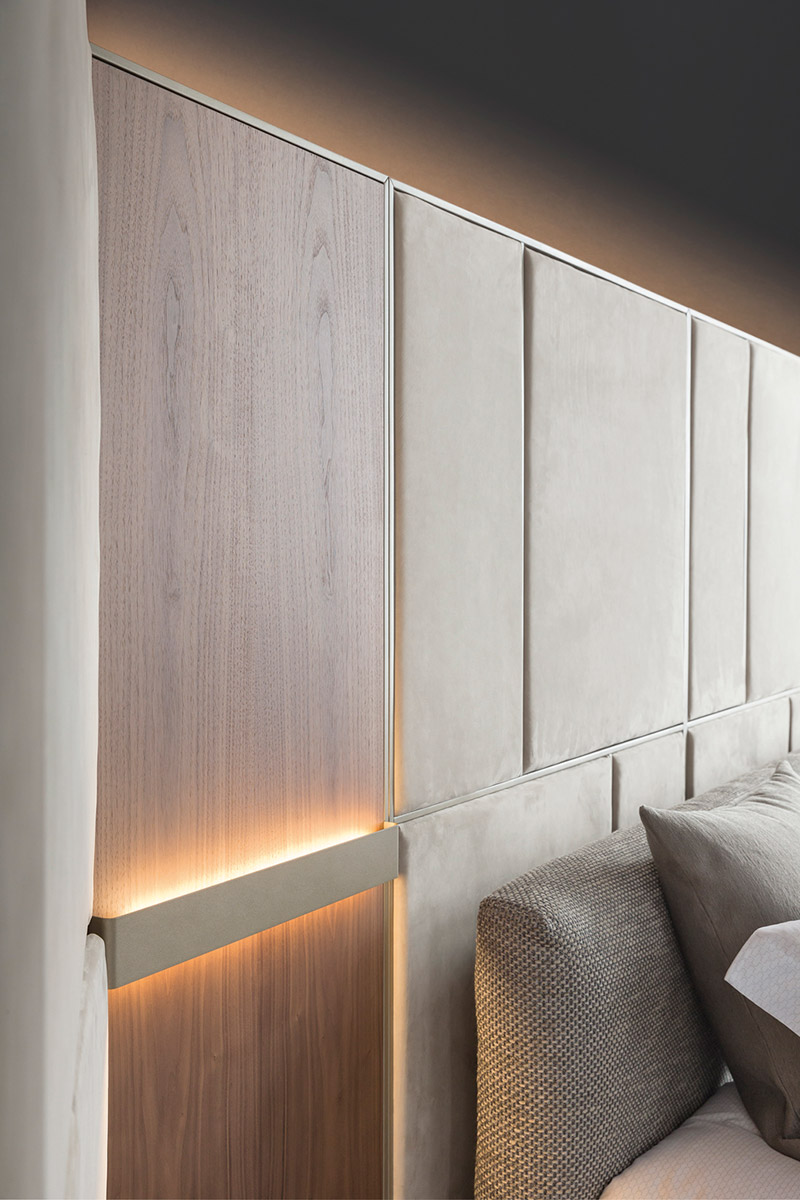 Italijanski brend Natevo izložio je ovaj interesantan krevet sa integrisanom svetiljkom na uzglavlju u kombinaciji furnira i štofa.