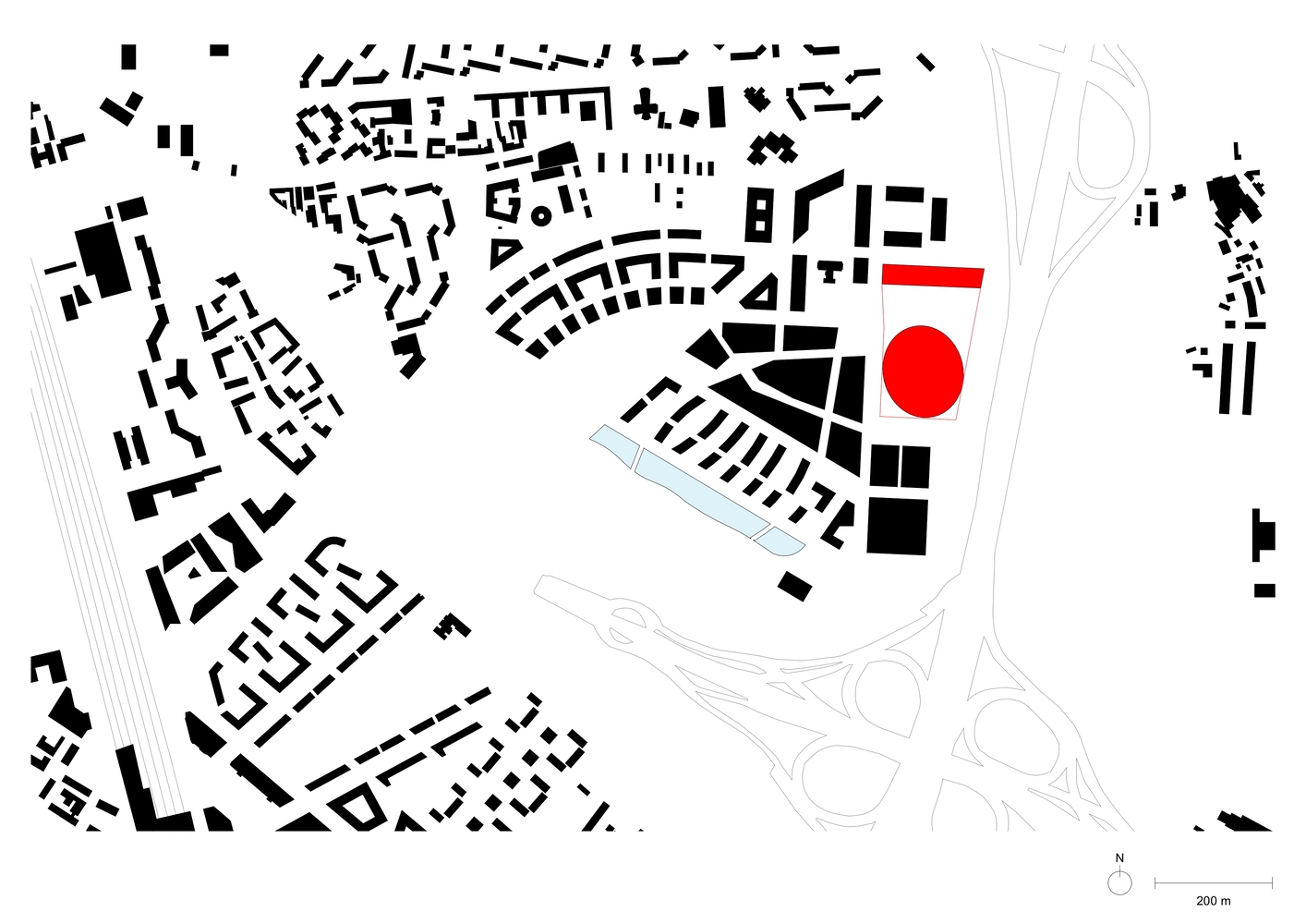 Arena je postavljena na južnom kraju lokacije, dočekuje posetioce koji dolaze sa zapada i vodi ih širokim stepenicama do podignutog podijuma koji zauzima skoro celu parcelu. Prostrana pjaca od preko 10.000 kvadratnih metara takođe može da se koristi kao mesto za događaje na otvorenom.