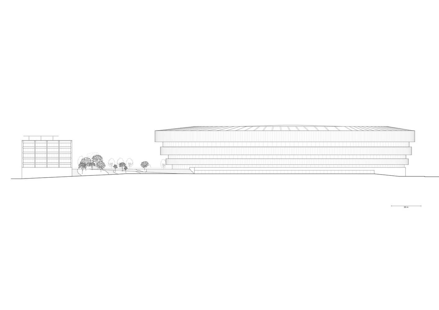 Iznad ovog monolitnog podijuma, tri prstena sa gradacijom u visini izgledaju kao da lebde jedan iznad drugog, obavijajući celu zgradu. Njihove metalne površine su definisane blistavim aluminijumskim cevima tokom dana i integrisanim LED trakama koje osvetljavaju fasadu noću, objasnili su iz studija.