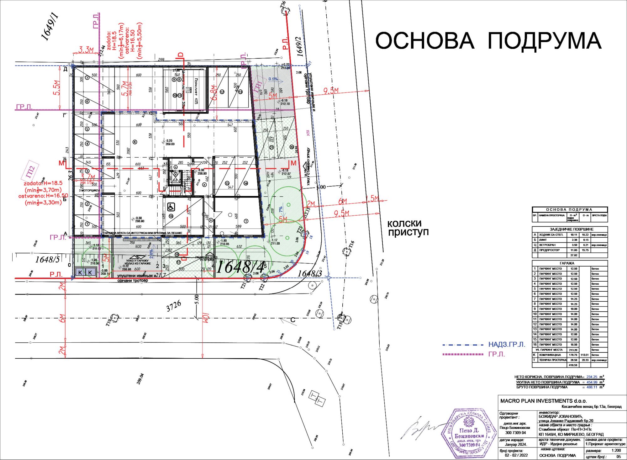 Podrumska etaža, realne BGRP od 488 m², planirana je većim delom za garažu, manjim delom za pomoćni prostor.