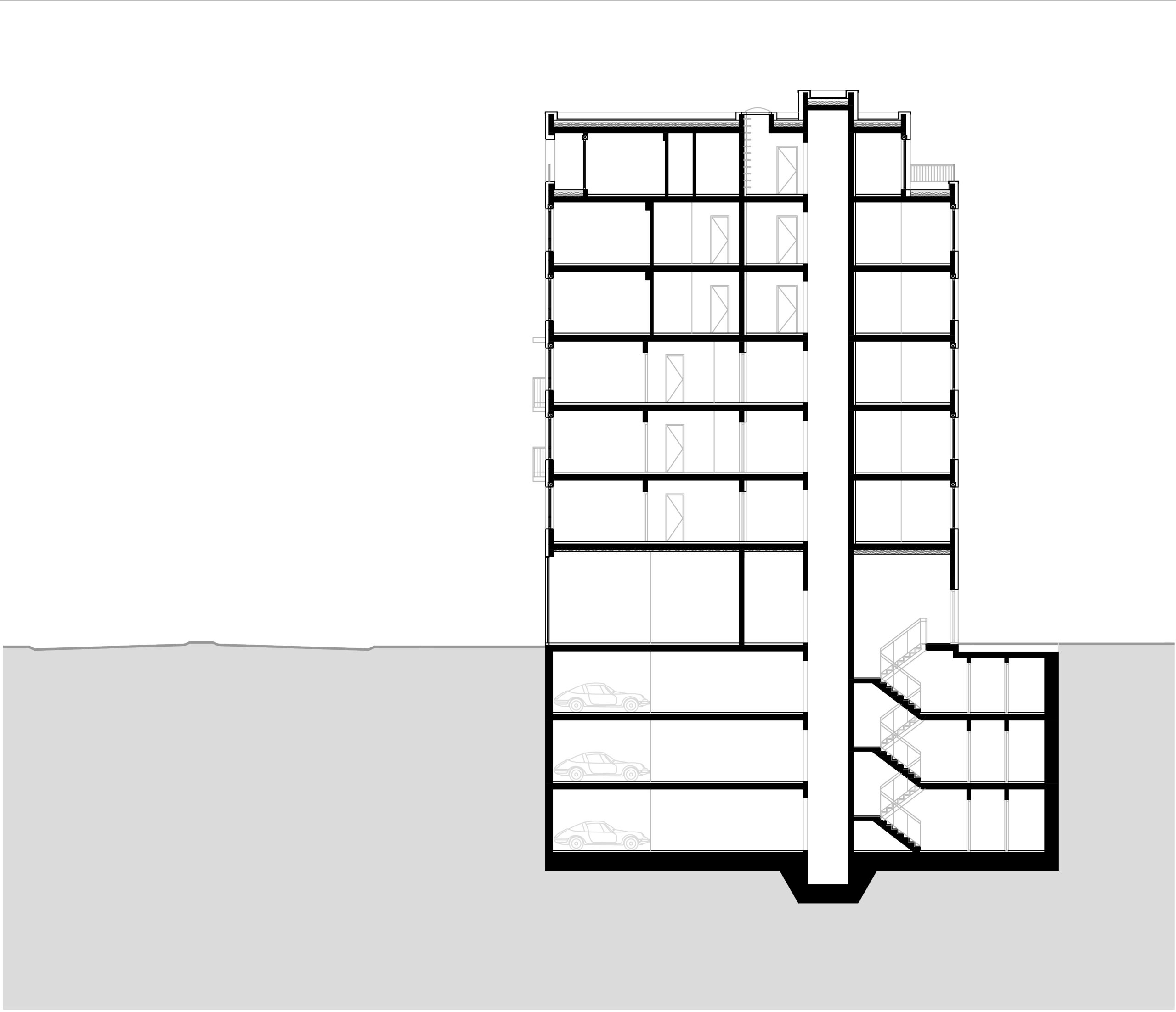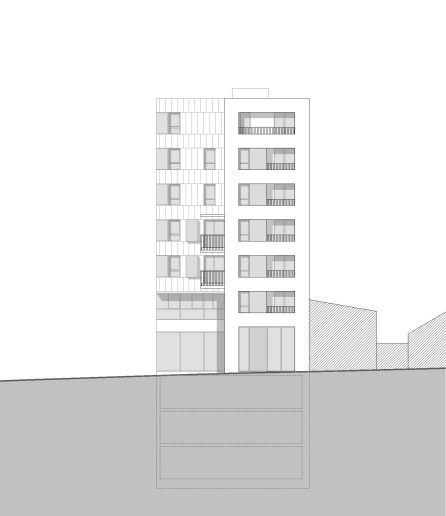 Paralelno s tim, volumen orijentisan ka ulici Marka Oreškovića odstupa od ulice Dimitrija Tucovića i nadvija se iznad poslovnog prostora, čime se stvara prepoznatljiva dinamička forma na uglu parcele.