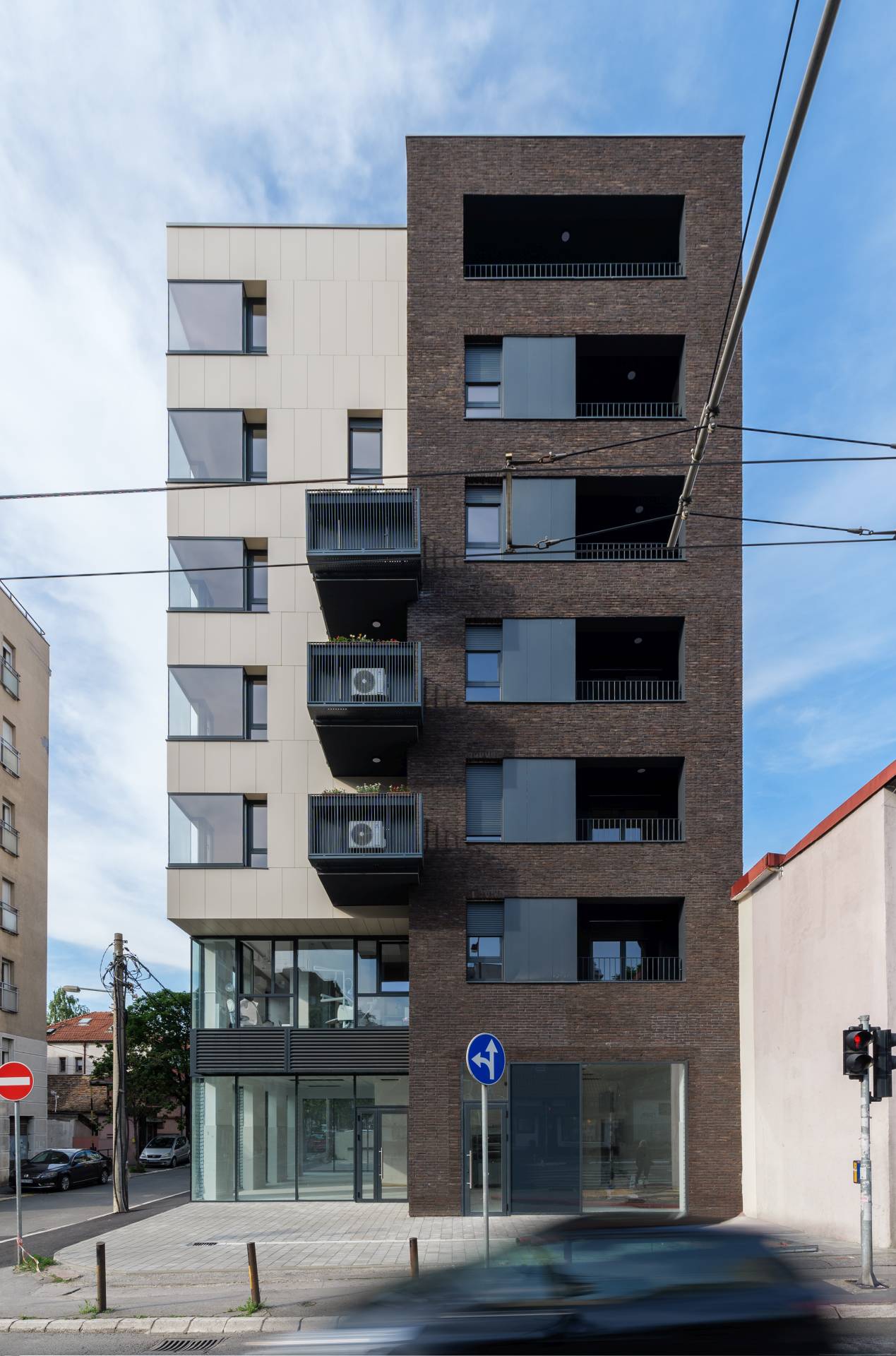 Estetski i funkcionalno, fasada kombinuje savremene materijale i detalje: svetle ploče, tamne listele i velike staklene površine koje otvaraju enterijere ka ulici. Istovremeno, zidni paneli i ugaoni otvori definišu ritam i dinamiku fasade.