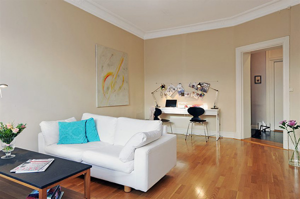 Na zidu krem boje ističu se visoke bele ugaone lajsne. U svetlom prostoru, parket i drugi malobrojni nameštaj izveden u prirodnom drvetu postaju upadljivi i dominantni.