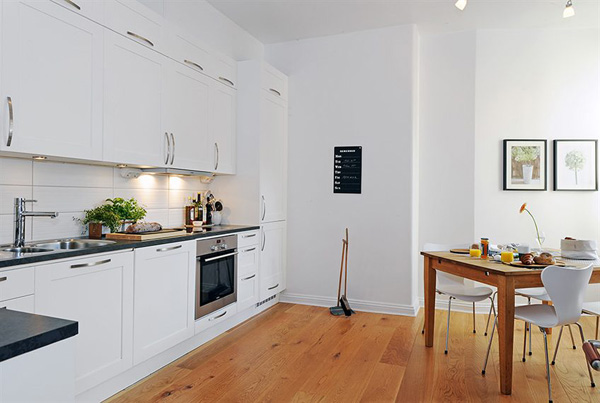 Kuhinja je jednostavne forme sa mnogo delova za odlaganje. Kao i u celom stanu i ovde je dominantna bela boja.