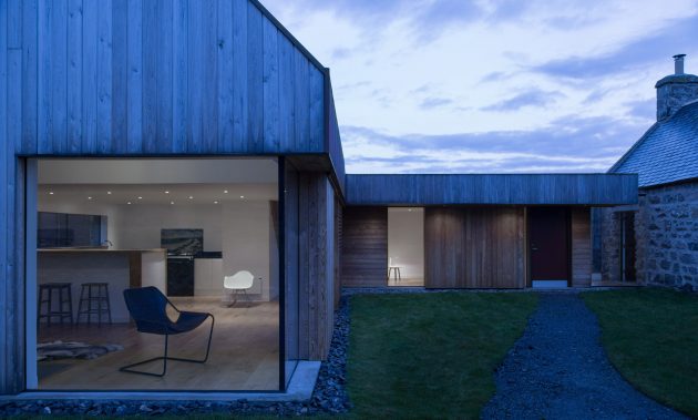 U proširenom delu od 120 kvadratnih metara smeštena je kuhinja i dnevni boravak s trpezarijom. Dominantan segment prostora jeste zastakljeni ugao kuće kroz koji se pruža pogled na planinu Lochnagar.
