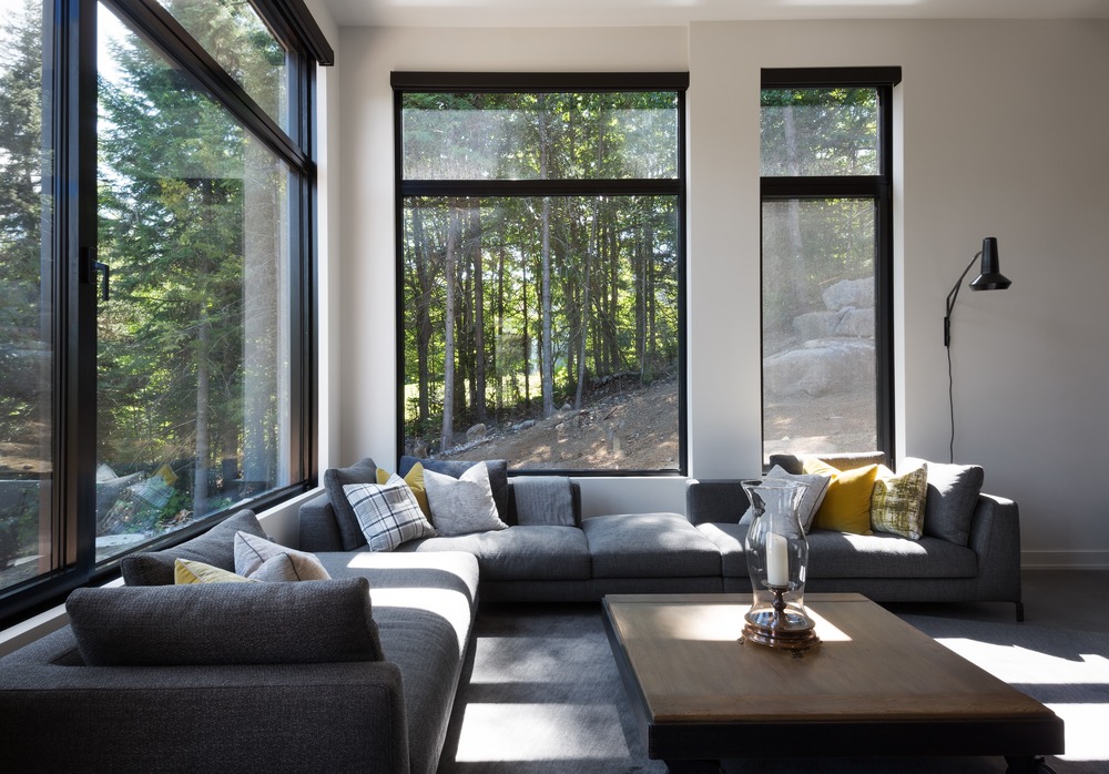 Ovu modernu kolibu čini nekoliko segmenata, pa tako njen gornji nivo sa krovom klasičnog oblika gleda na jezero kroz konzolu, dok je baza kuće smeštena na padini.