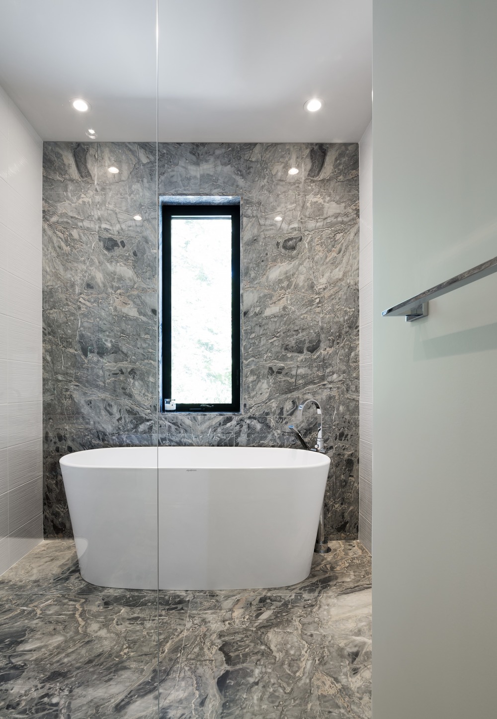Donji deo kuće karakteriše savremeni dizajn sa ravnim krovom od cinka, velikim prozorima i otvorenim prostorom u enterijeru. Dnevni boravak smešten je na dva nivoa i pruža predivan pogled na okolinu.