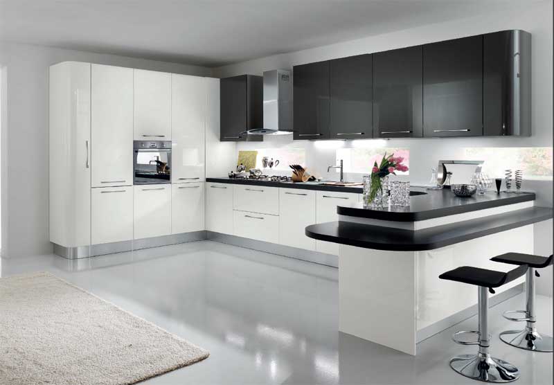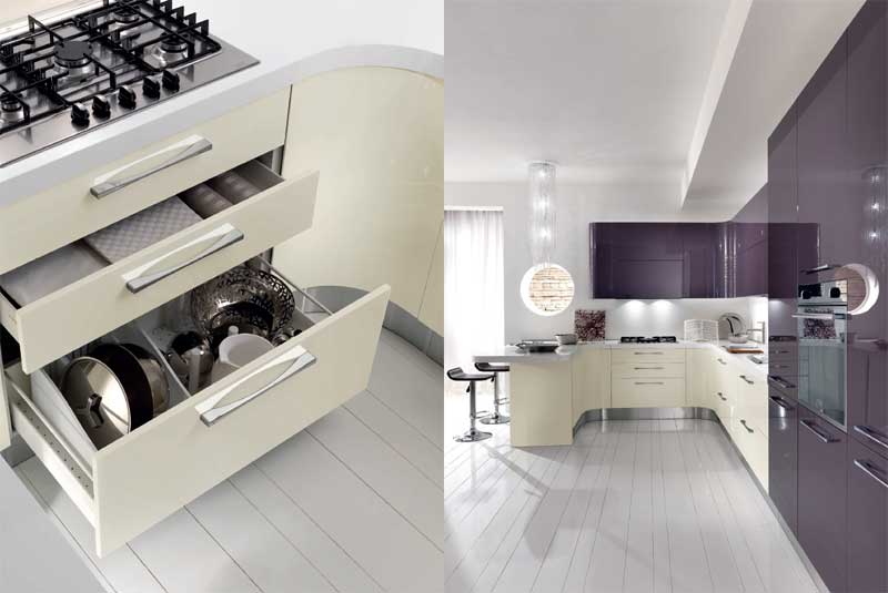 Ove kuhinje su uglavnom izvedene od bojenog medijapana (MDF-a) jer univer je vrlo teško ovako saviti. Iako teže i skuplje za izvođenje, kuhinje bez oštirh ivica su vrlo popularne i tražene.