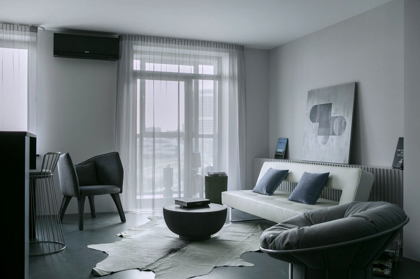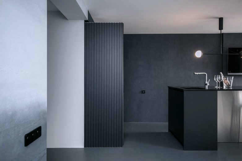 Na zahtev vlasnika, arhitekte firme Zrobym architects su pokušale da u što većoj meri izbegnu primenu svetlih tonova u enterijeru i da dizajn kreiraju u monohromatskoj skali.