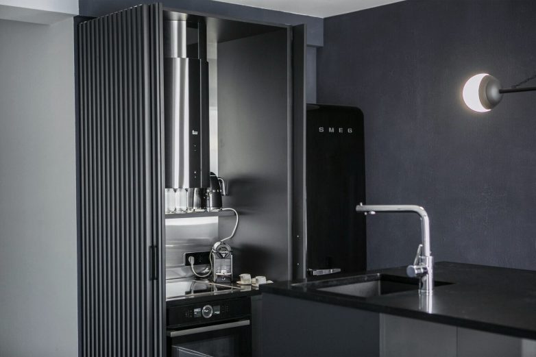 S obzirom da je vlasnik stana iz Italije i da ovaj apartman površine 60 kvadratnih metara služi samo sa privremeni boravak jedne muške osobe, to je prouzrokovalo potpuno odsustvo garderobera i svođenje kuhinjskih elemenata na minimum. Jedini konkretni element kuhinje je prostrano ostrvo/šank oko kog se neometano odvija cirkulacija u dnevnoj zoni stana.