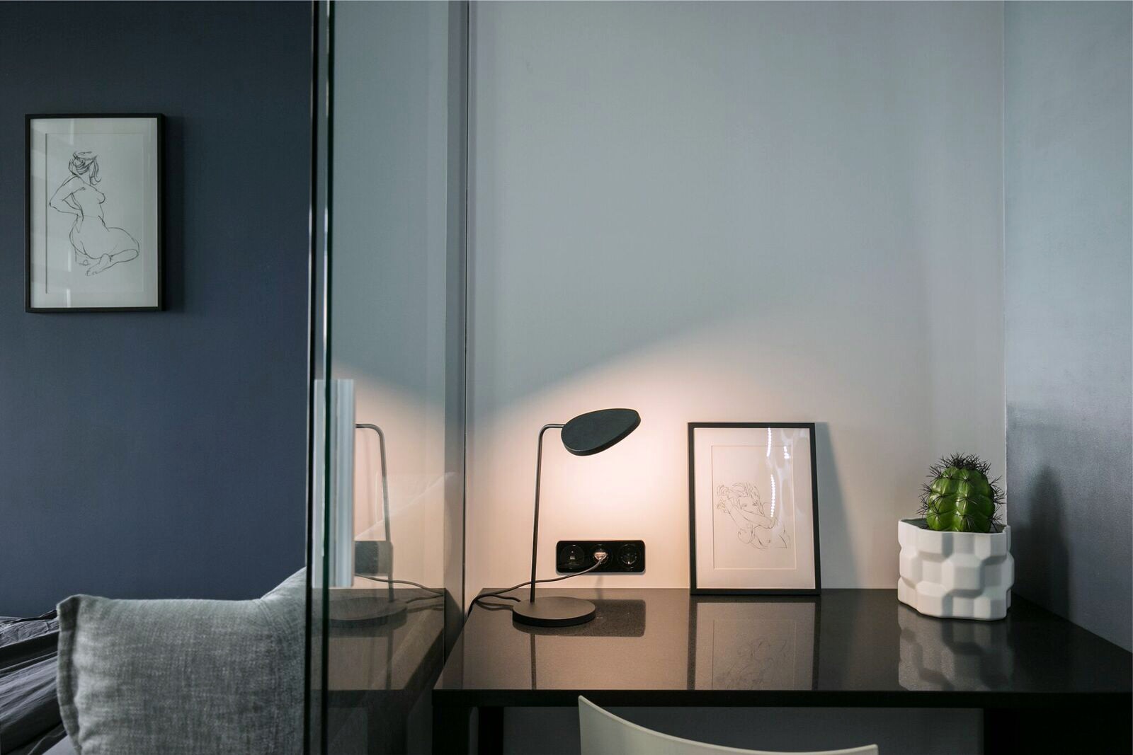 Prelazak od tamno plave do svetlo sive, kako na elementima rasvete na zidu, tako i u ostatku enterijera simbolizuje dubinu prostora, ukazujući na ideju o stvaranju misteriozne atmosfere u stanu.