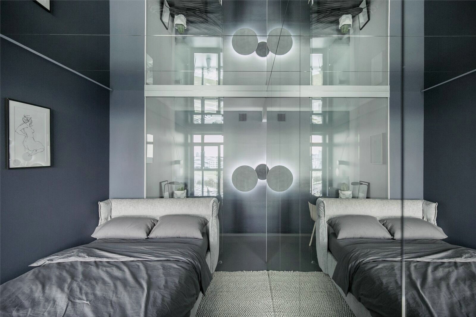 Svedeni dizajn spavaće sobe ujedno je na suptilan a opet i dramatičan način, razigran prekrivanjem čitave površine zida i plafona ogledalima.