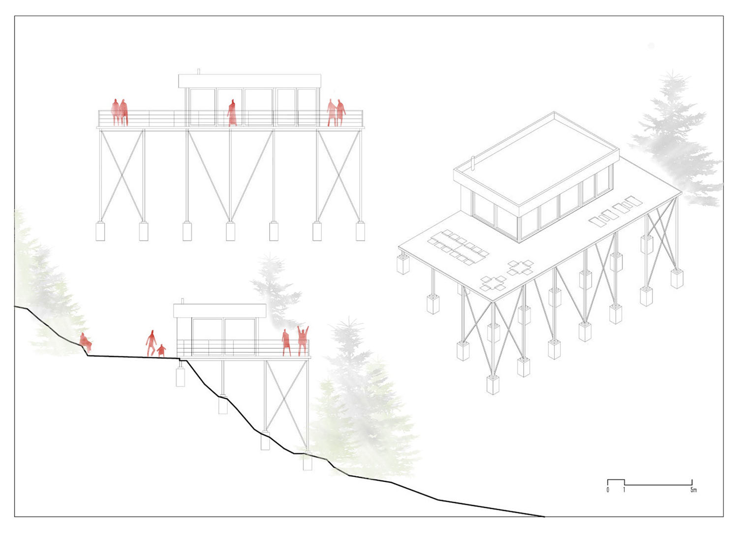 Konstruktivni sistem terasa/vidikovac urađena je sa vitkim stubovima, ukrućenjima i mnogobrojnim zategama. Kuća se oslanja na 28 čeličnih stubova, 28 betonskih temelja i 7 čeličnih greda koje se pružaju u poprečnom pravcu. U podužnom pravcu terasa je popločana perforiranim pocinkovanim limom. Perforirani lim je lagan, ali sistemu daje neophodno ukrućenje i stabilnost.