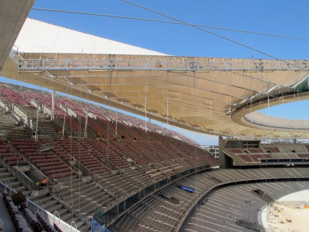 Krov stadiona osmislio je Cruz y Ortiz Arquitectos uz podršku inženjera iz nemačke kompanije Schlaich Bergermann Partner. U videu od minut i 30 sekundi, koji nam donosi FCC Construccion, može se videti kako su izgledali četvoromesečni radovi na instalaciji 96 radijalnih panela na severnom delu stadiona koja su napravljena od PTFE-a, odnosno, polukristalne polimerne plastike.