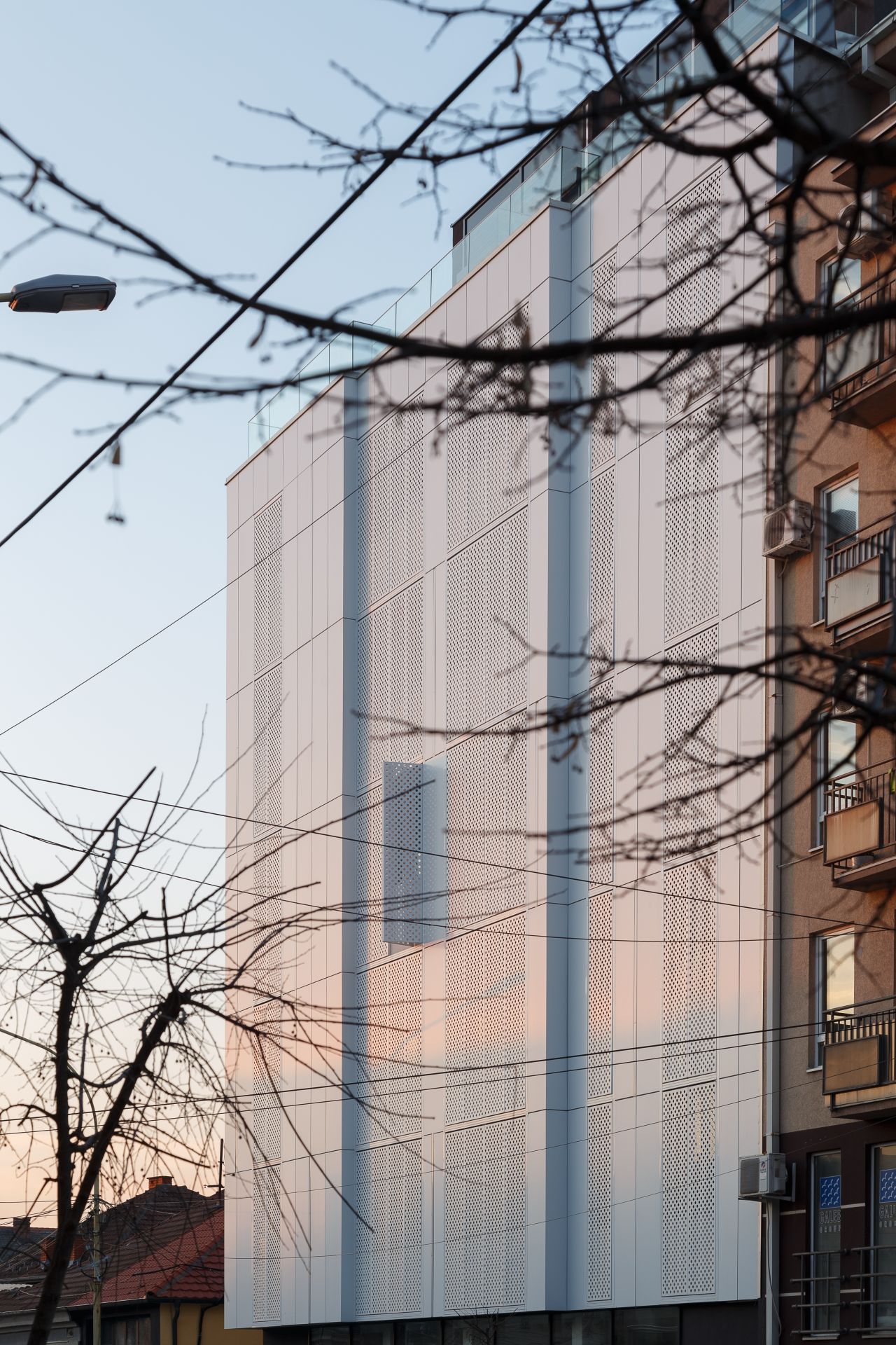 Dinamičnost bele fasadne forme ostvarena je korišćenjem perforiranih prozorskih šalona.