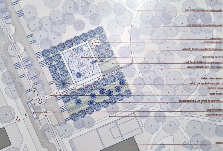 Oko objekta je predviđena sadnja drveća koje su u vezi sa delima Đorđa Balaševića: orah (…na dan kada sam rođen…), bagrem (…ne lomite mi bagrenje…) i rasad breza, a sve osmišljeno kao park u parku.