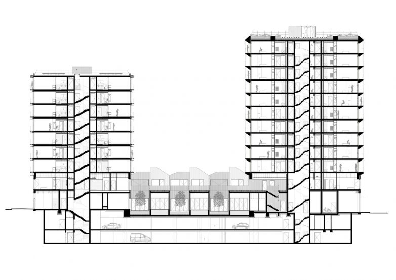 Tim arhitekata dizajnirao je dva međusobno povezana tornja, koristeći se primarno drvetom, staklom i betonom, a kao rezultat je realizovano ukupno 105 stanova.