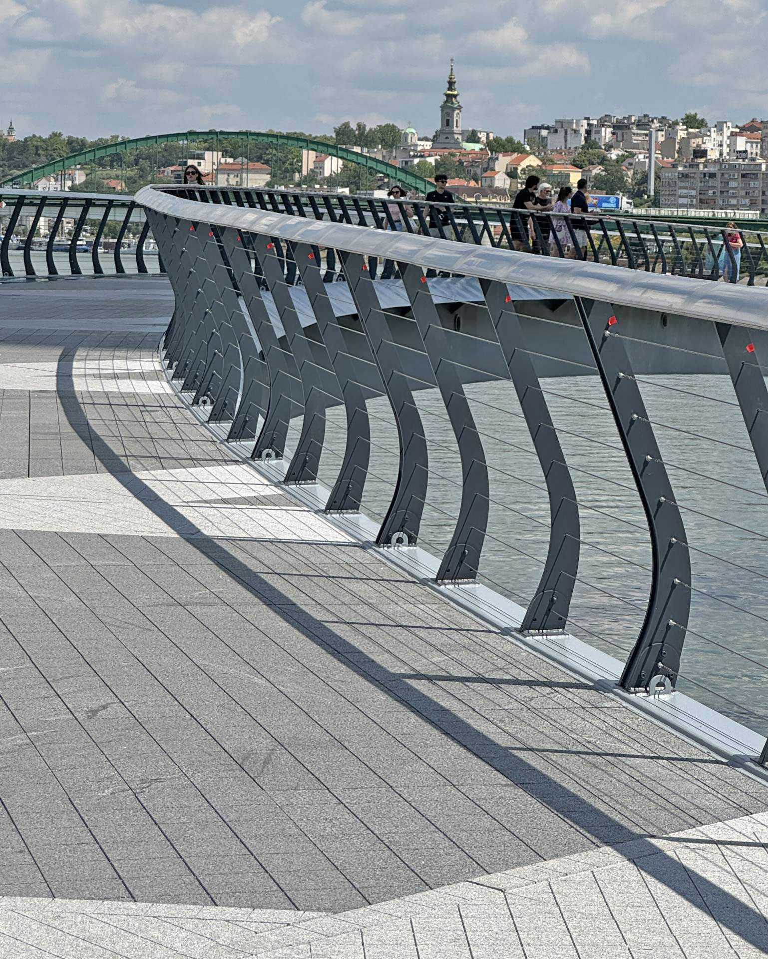Čelična konstrukcija na Savi Promenadi sastavljena je od sedam visećih čeličnih elemenata koji formiraju pešačku stazu koja je u jednom delu transparentna.