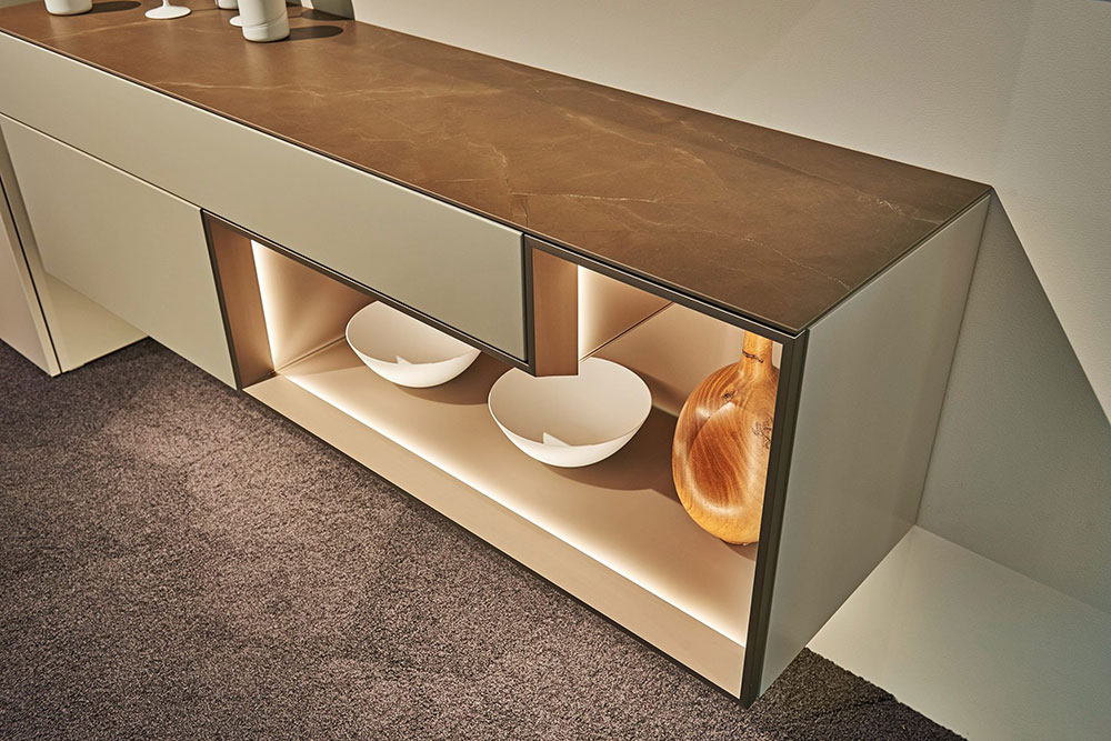 Razlika u odnosu na prethodne modele jeste da se vidne ivice izrađuju od tankih ploča sa zaštićenih staklom. Nameštaj se pravi u kombinaciji jednobojnih frontova visokog sjaja koji se kombinuje sa prirodnim teksturama drveta.