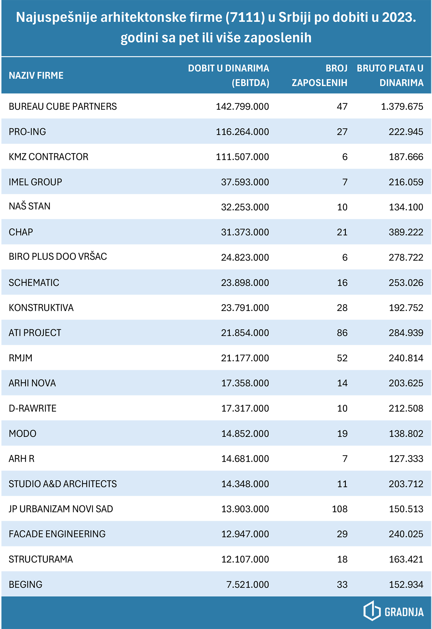 Na vrhu liste najuspešnijih arhitektonskih biroa u Srbiji nalazi se Bureau Cube Partners, sa ostvarenom neto dobiti od čak 140.799.000 dinara. Ovaj biro, sa sedištem u Beogradu, zapošljava 51 arhitektu, a prosečna bruto zarada u prethodnoj 2023. godini iznosila je neverovatnih 1.379.675 dinara.