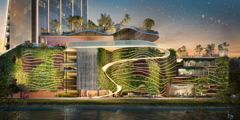 Predstavljeni renderi nebodera prikazuju elegantnu i inovativnu strukturu, sa terasama koje nose bazene i bujno uređen pejzaž.