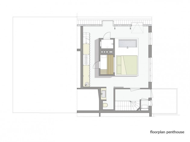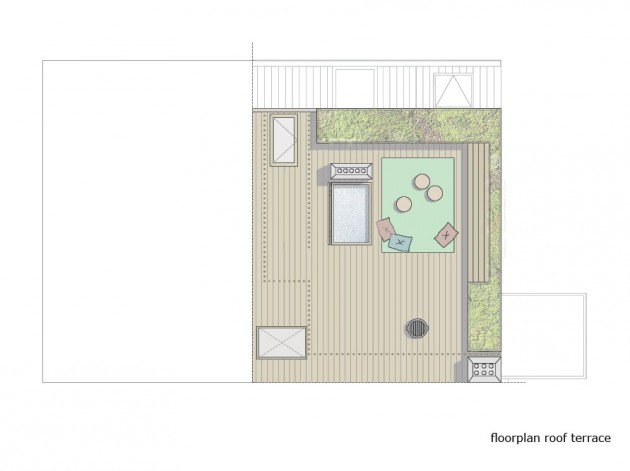Treći zahtev bio je da se ovaj penthaus pretvori u mesto za intezivno druženje. Zato je ravan krov, popločan dekingom, potpuno osposobljen za pravljenje žurki uz roštiljanje i još jednu Jacuzzi kadu. Krov pruža sjajan pogled na Roterdam pa se možete brčkati u kadi, pijuckati piće i uživati u panorami.