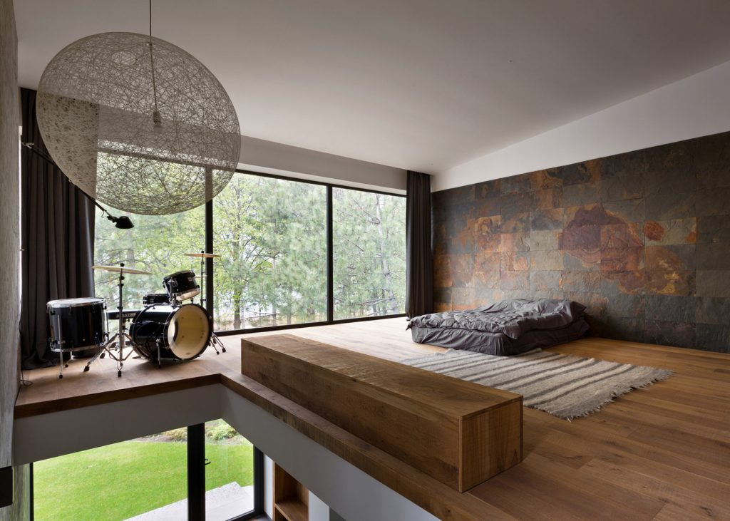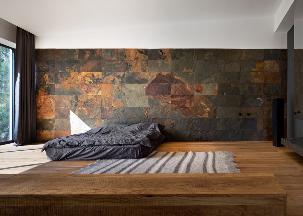 Ni ostatak kuće nije ništa manje zanimljiv. Na sprat se penje konzolnim stepenicama od drveta a tamo će vas sačekati još jedno iznenađenje. Minimalistički opremljena soba kojom dominiraju dve stvari. Prvi je zid prekriven kamenom živopisne strukture.