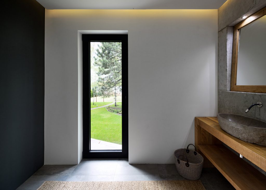 Plac na kojem je sagrađena ova raskošna kuća ima sjajan pogled ka dolini i arhitekti su maksimalno želeli da iskoriste ovu prednost. Zato je ceo zid dnevne sobe u staklu koje omogućava neometan pogled. Međutim, u krajoliku možete uživati i tuširajući se jer je tuš-kabina postavljena takođe u dnevnom boravku.