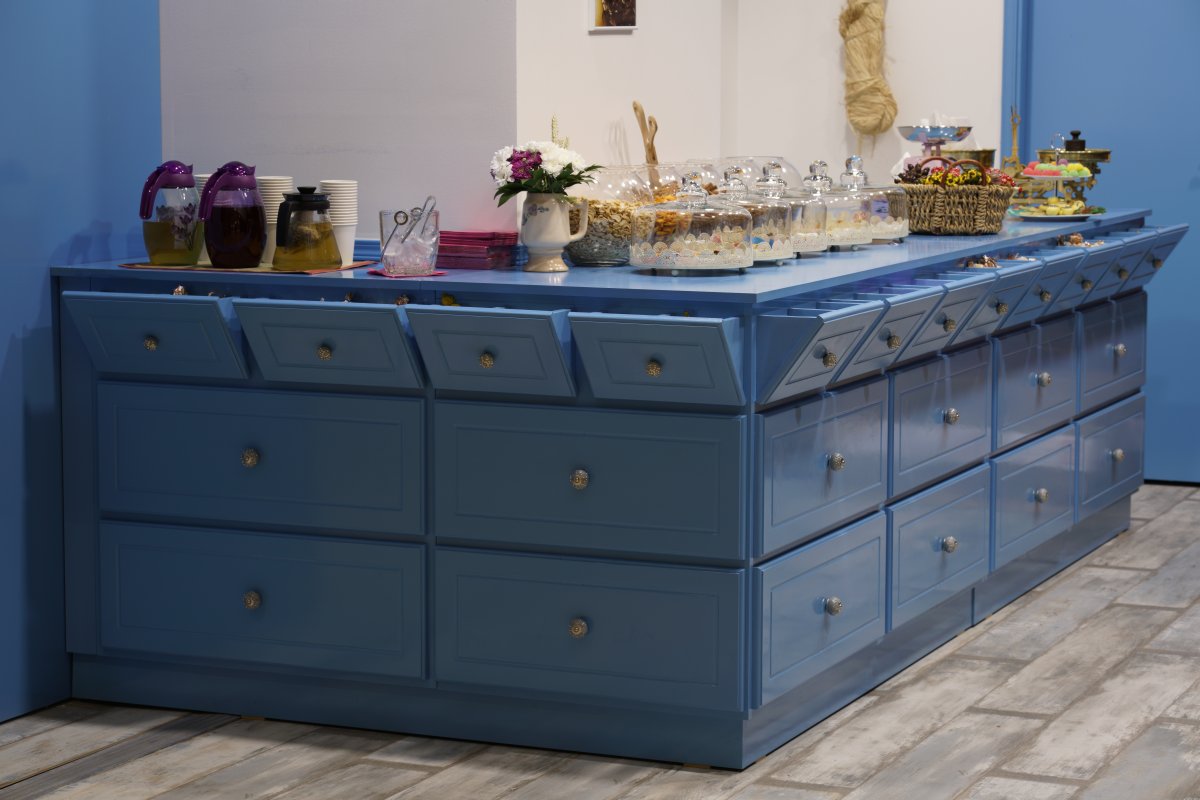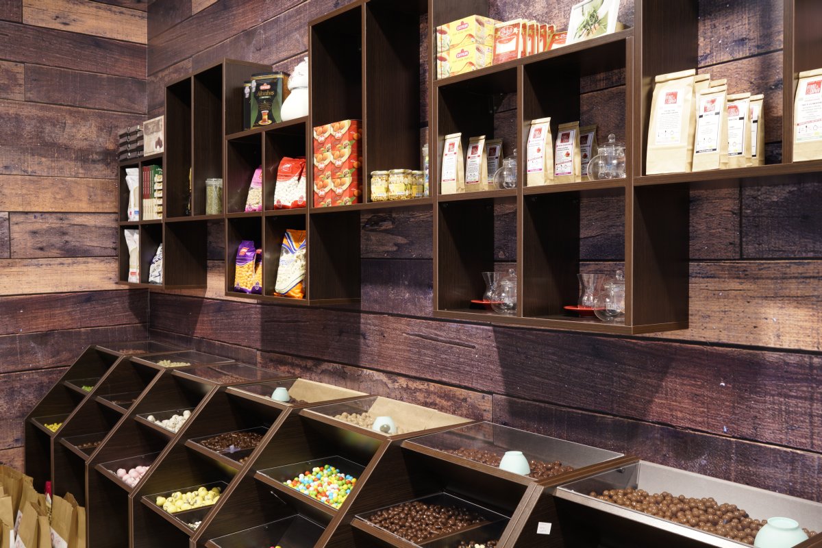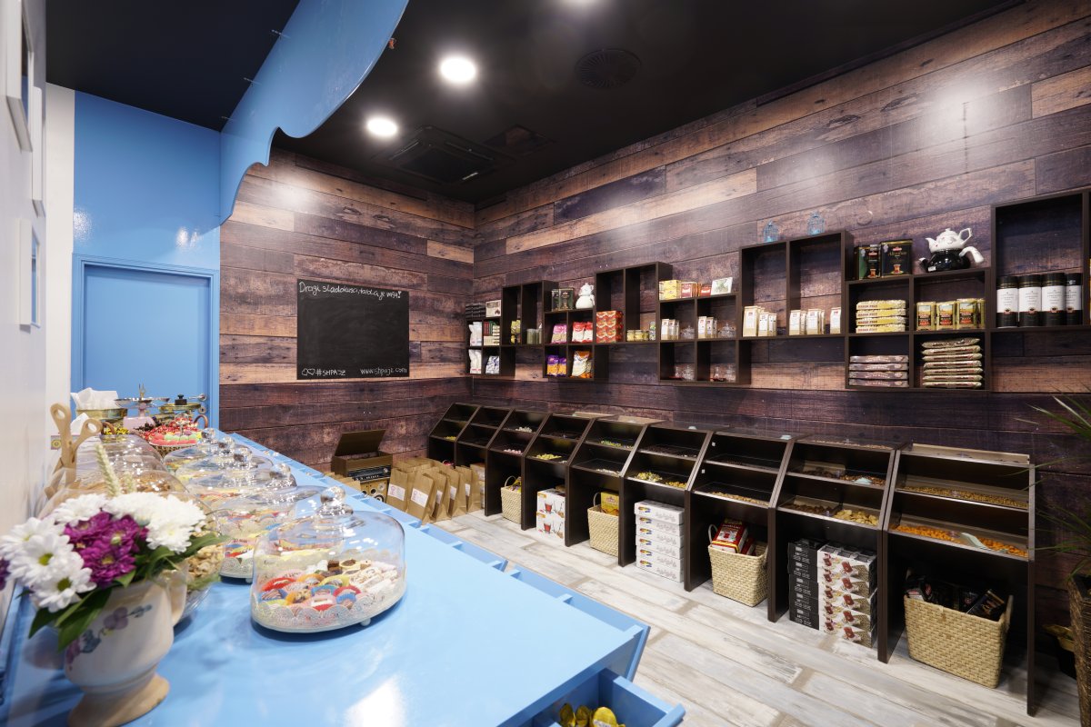 Sam dućan sastoji se od velikog plavog kredenca na jednoj strani i otvorenih džakova i vreća na drugoj. Prirodni materijali i boje nas odvode nazad u detinjstvo puno zaboravljenih poslastica.