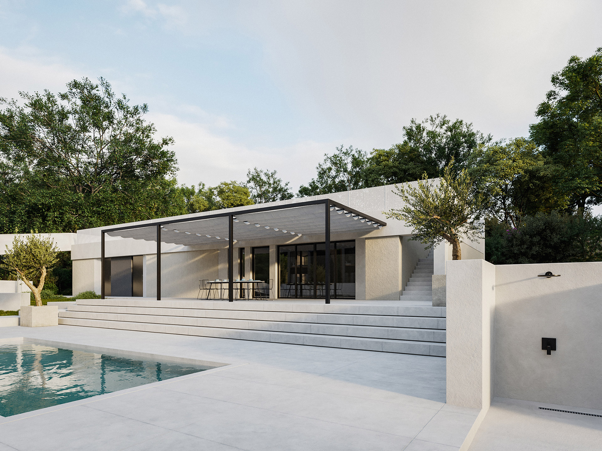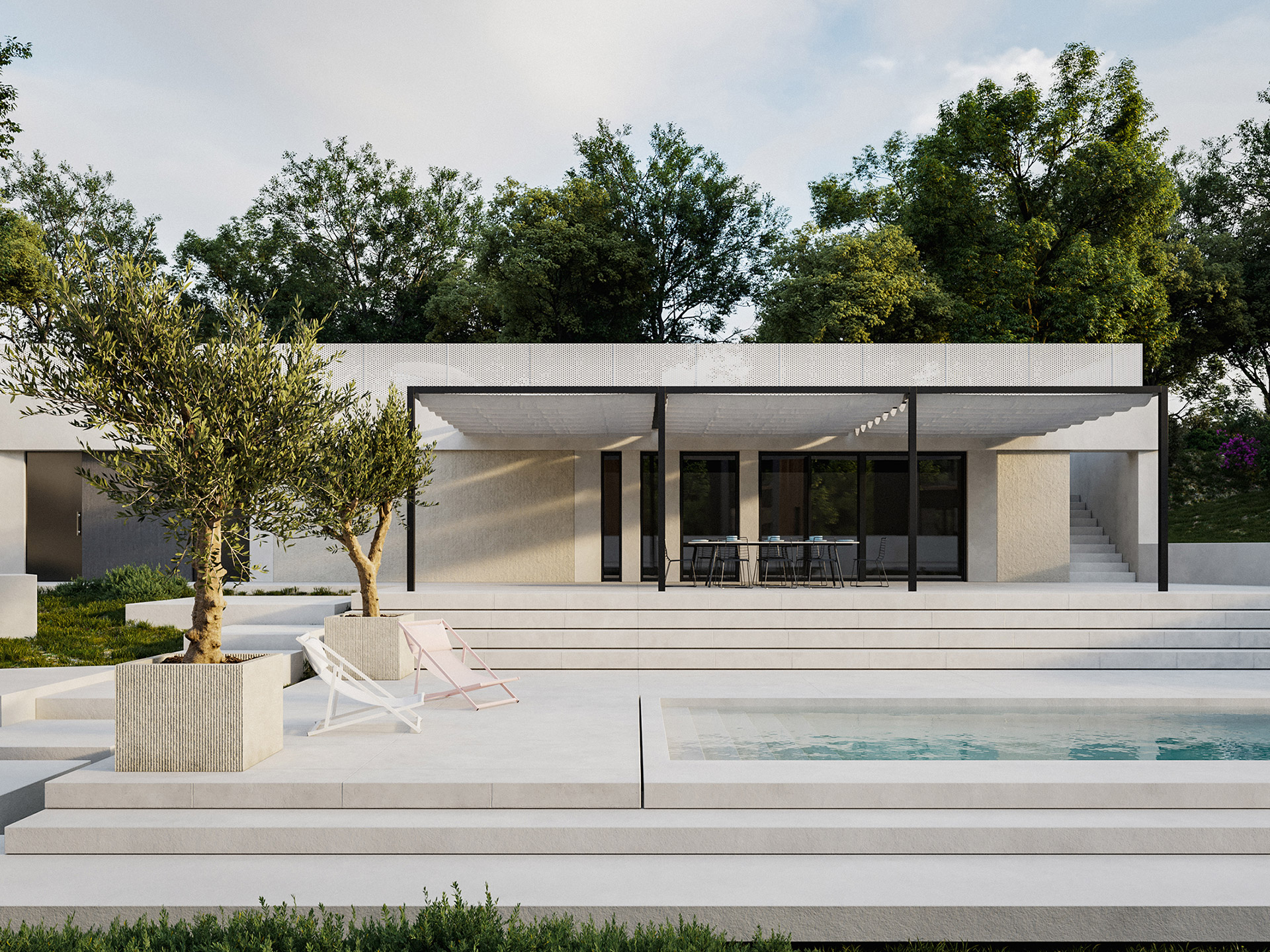 Spoljna obrada pomoćnog i partera, se zasniva na različitim obradama iste vrste kamena i na poliranom, toniranom betonu, te na cementnom malteru sa površinskom obradom i impregnacijom. Fasadne obloge pomoćnog objekta su kamene, tonova iz toplijeg valera, nežno krem i pesak tonova i direktno su konfrontrirane grubljoj strukturi „grebanog“ maltera, kasnije toniranog i impregniranog prema željenom tonu.