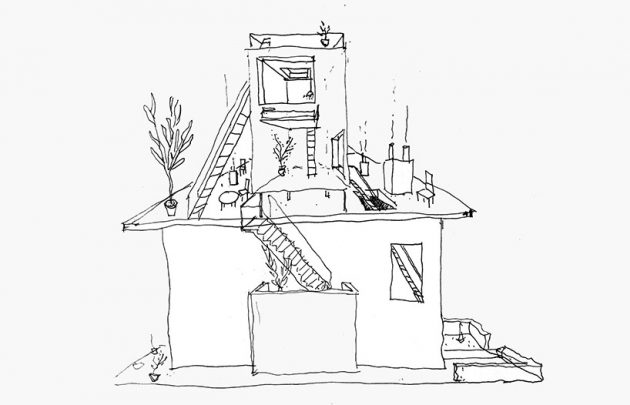 Kućica je osmišljena kao u potpunosti funkcionalna stambena jedinica za dvanaestogodišnjeg dečaka, u koju se ulazi sa krova porodične kuće.
