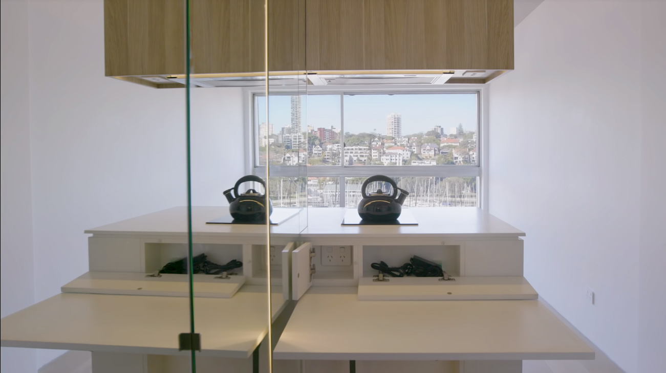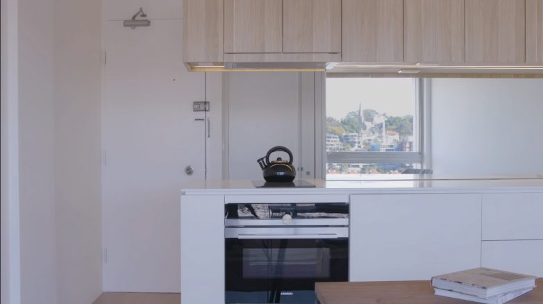 Najveća pogodnost ovog apartmana površine 27 m2 jeste pogled na Zaliv Elizabet. Ova pogodnost dodatno je naglašena. Ogledala su svoje mesto našla između i iznad kuhinjskih elemenata, gde se inače postavljaju pločice.