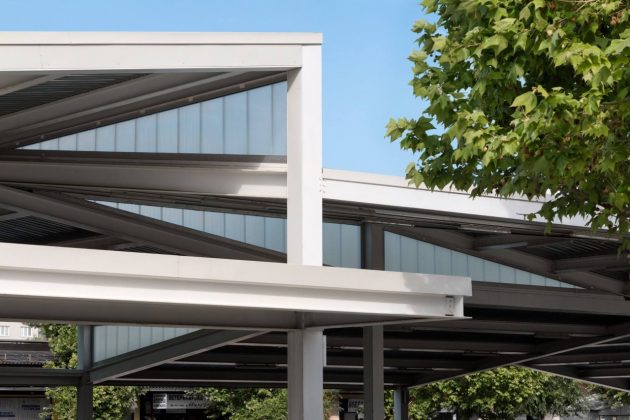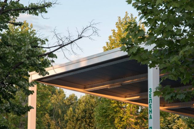 Moćne nadstrešnice od čelika u savršenom su skladu s još moćnijim drvećem.