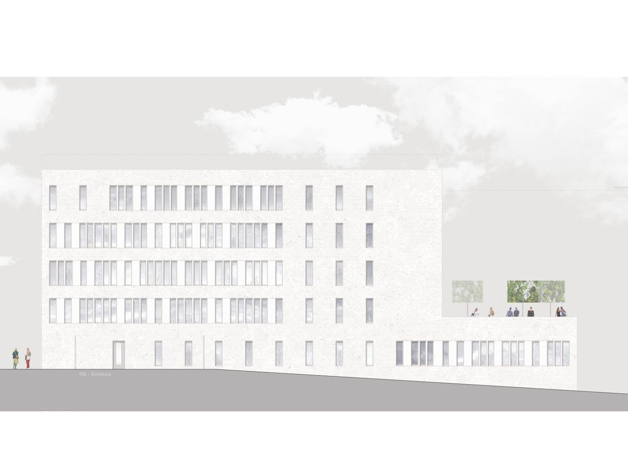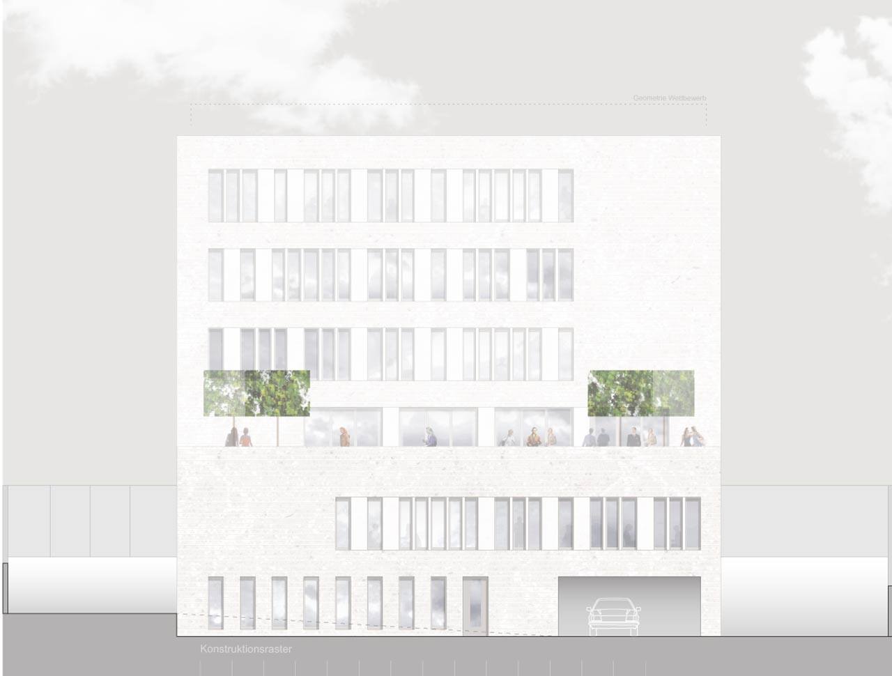 Nemački autori su, kao i neki od naših biroa na konkursu, ponudili atraktivno rešenje, sa dva atrijumska prostora, u kojem dominira jednostavna, pročišćena, kubična forma. Zanimljivo je da su autori na izvestan način želeli da iskažu povezanost nove zgrade sa državom u kojoj će biti izvedena, predloživši u specifikaciji materijala da kamene ploče od kojih će biti izvedena fasada, budu od sivkasto-beličastog mermera izvađenog na prostoru Srbije. Forma je pre svega bila uslovljena funkcijom, a fasada sa svojim uskim prozorskim otvorima i niskom, ali i pomalo klaustrofobičnom ulaznom partijom, aludira na fortifikacijske objekte, čime je dodatno stavljen akcenat na bezbednosni faktor svakog važnijeg diplomatskog predstavništva. Posmatrajući sa pročelja, arhitekturom dominira simetrija, sklad i perfekcija, a sve su to i dalje osobine nemačkog naroda, poslovanja i državne politike.