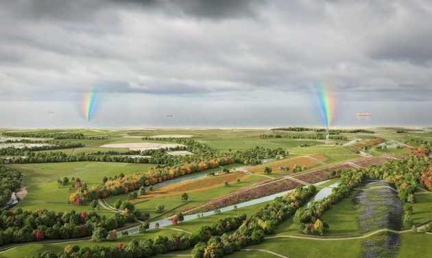 Idejno rešenje britanske firme One Creative Environments za pejzažno uređenje nove nuklearne elektrane u Engleskoj predlaže postavljanje dve velike staklene kule koje će korišćenjem svetla i izmaglice između sebe kontinualno kreirati veštačku dugu iznad lokaliteta. Koja je ideja za tako nešto?