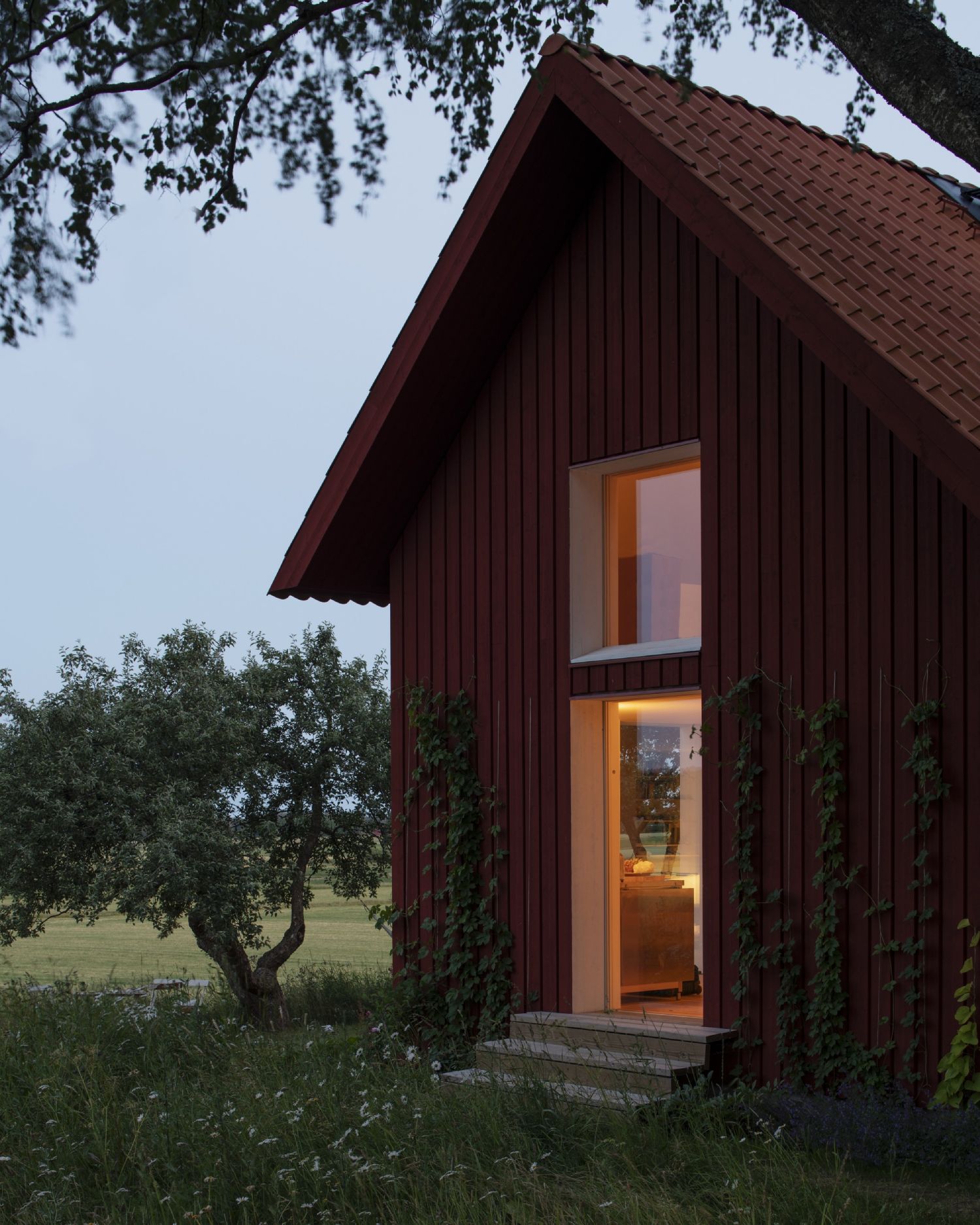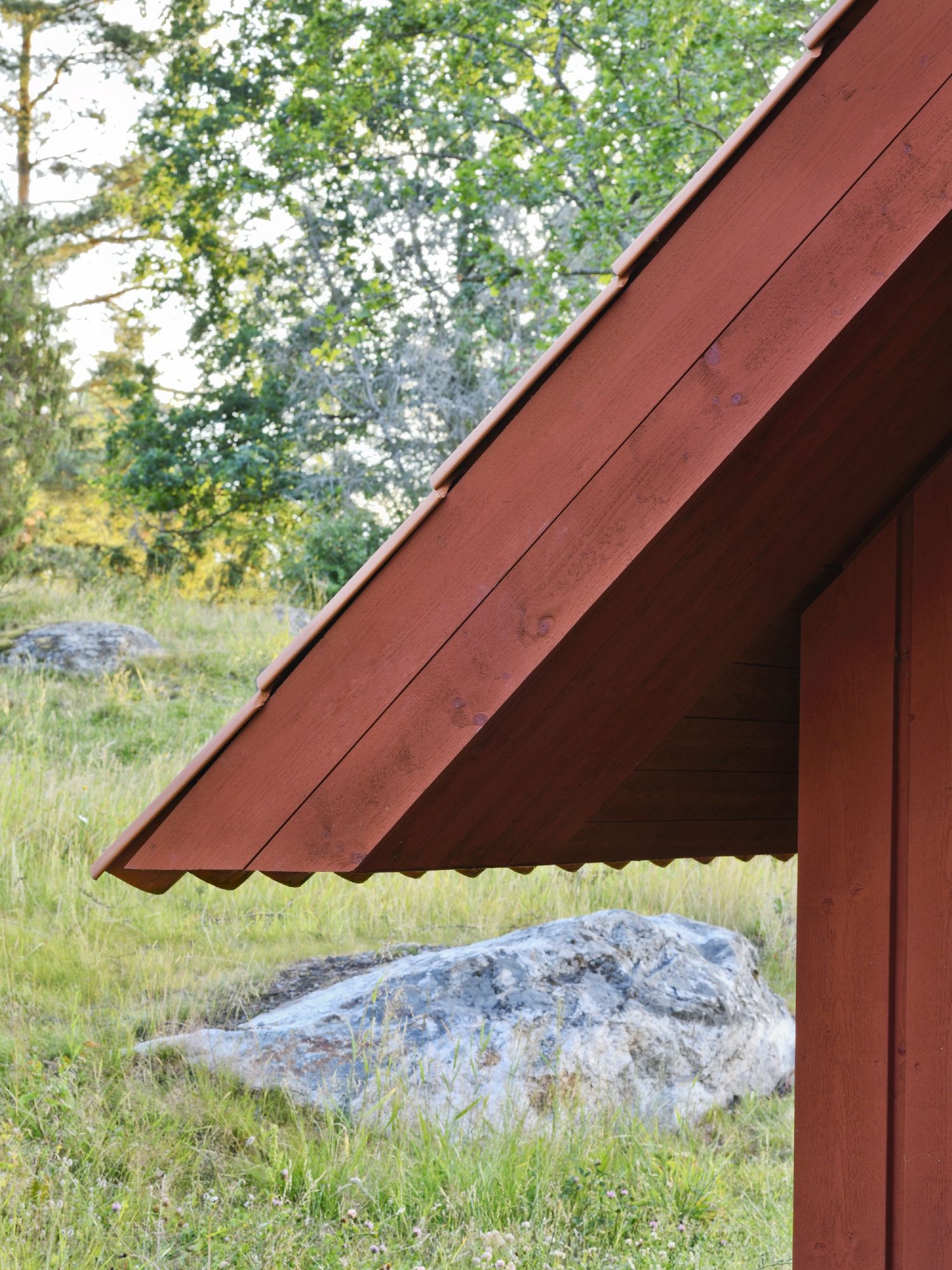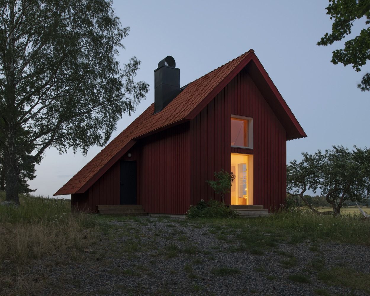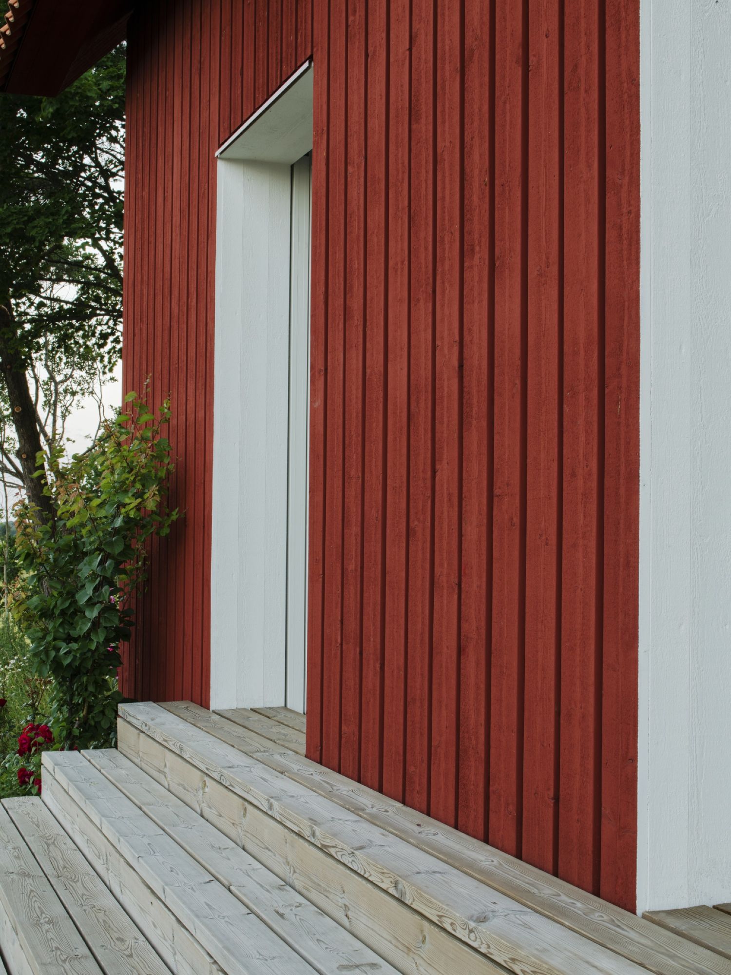 Spoljašnjost kuće je izvedena uz dominaciju crvene boje i to ne samo na drvenoj fasadi već i na krovu. Stakleni otvori na kući akcentovani su belim okvirima, dok su ulazna vrata jedino netransparentna i ona su u crnoj boji.