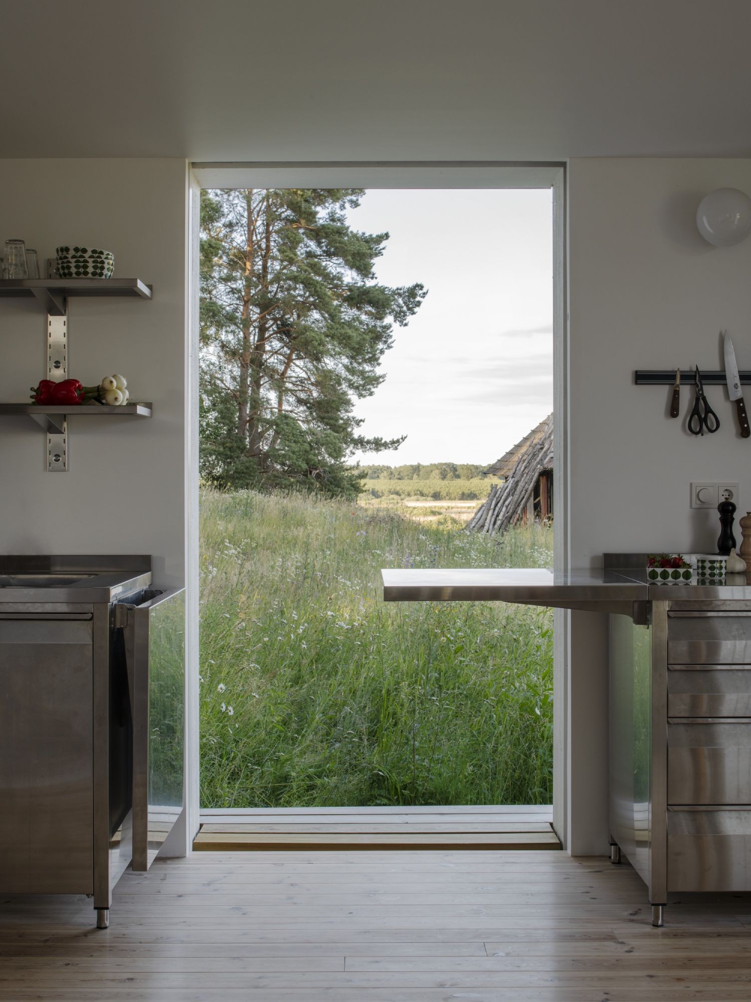 Kuhinja izvedena u potpunosti od nerđajućih elementa nesvakidašnji je prizor za jednu vikendicu… čak i u Švedskoj. Iako je u jednom delu prekinuta vratima, ona se može povezati dodatnim radnim površinama.