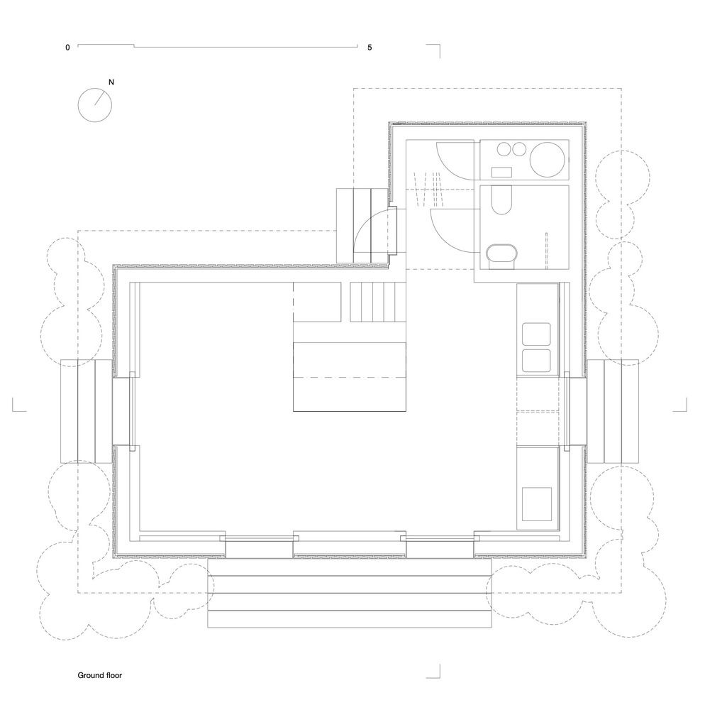 Novi objekat od 75 kvadrata oformljen je kao dvospratna struktura, gde je prvi sprat zadržao originalnu visinu plafona, ali sa kliznim skrivenim staklenim vratima od poda do plafona. Naspramno postavljena vrata stvaraju zanimljivu vezu unutrašnjosti kuće sa okolnim vrtom.