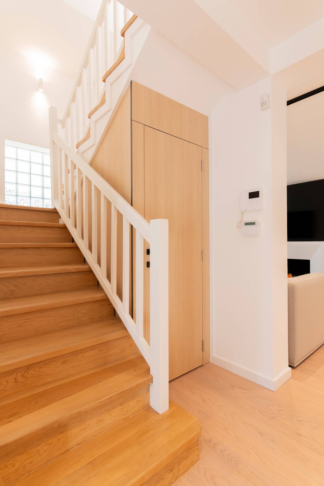 U prizemlju, kuća otkriva renovirani prostor sa kupatilom i ostavom integrisanim u sklopu stepeništa, nešto što prethodni plan nije uključivalo. Dalje se nastavljaju dnevni boravak i trpezarija koji se spajaju se u jedan veliki prostor akcentovan rasvetom, umetničkim slikama ali i kaminom kao fokus tačkom.