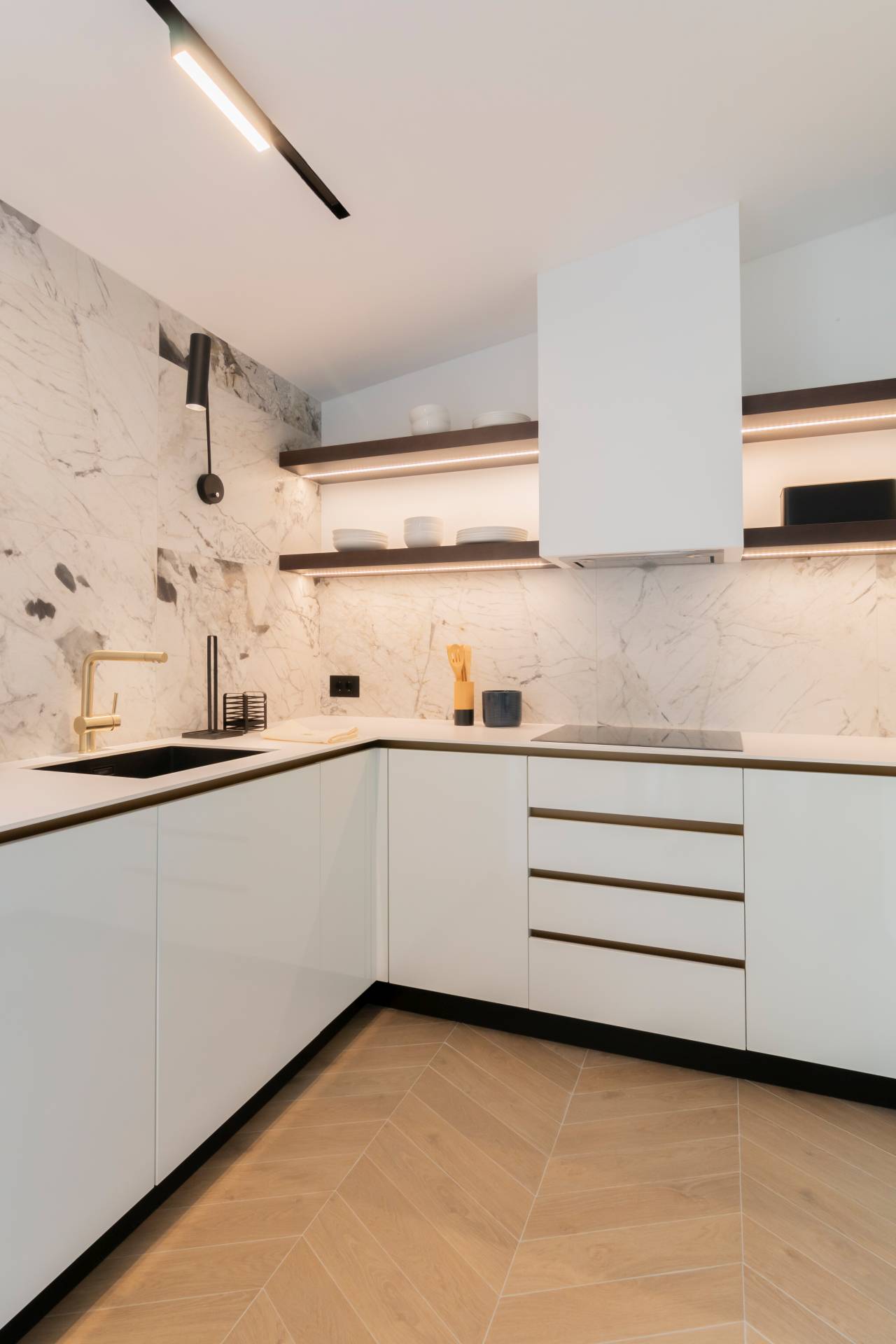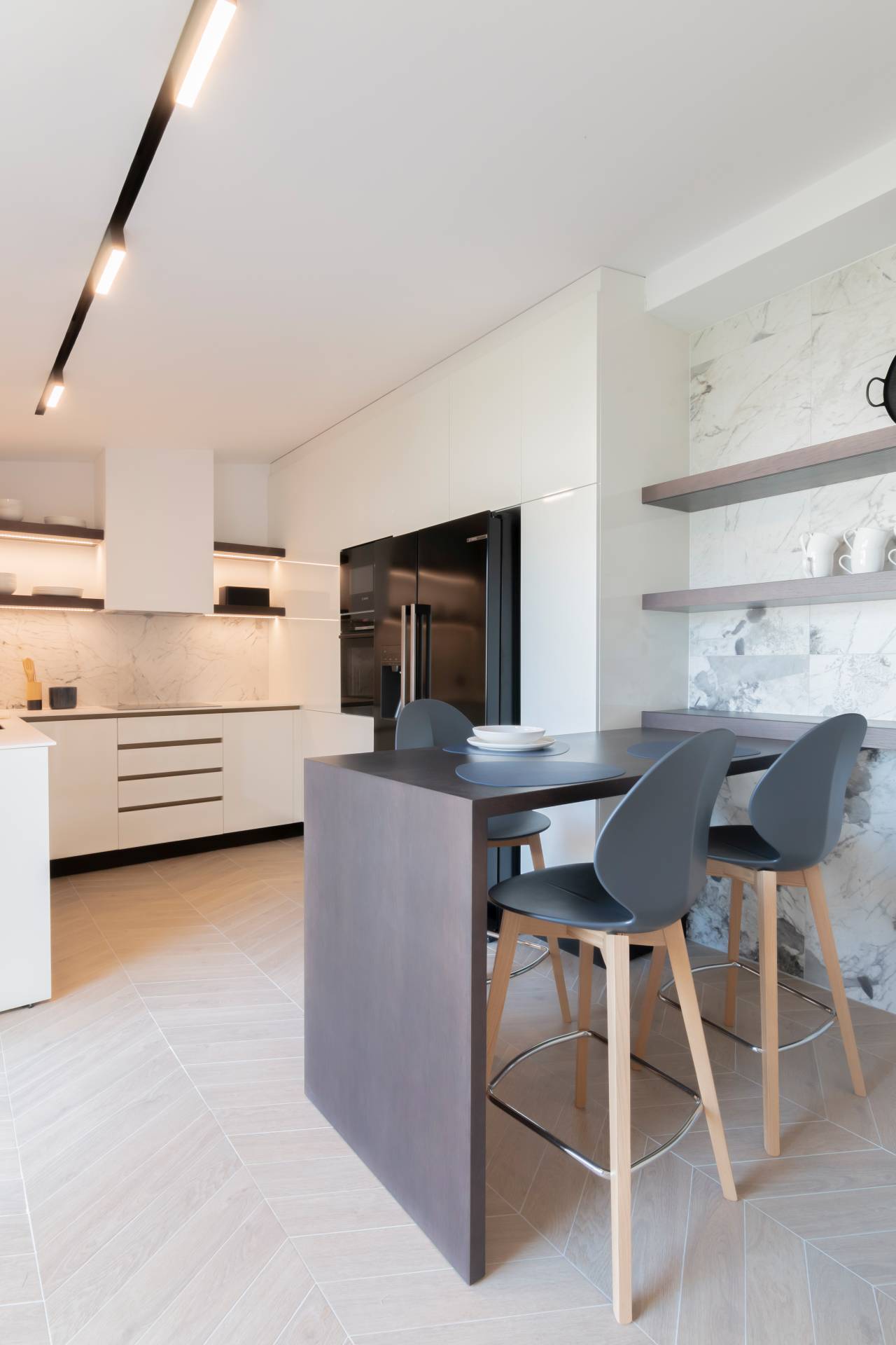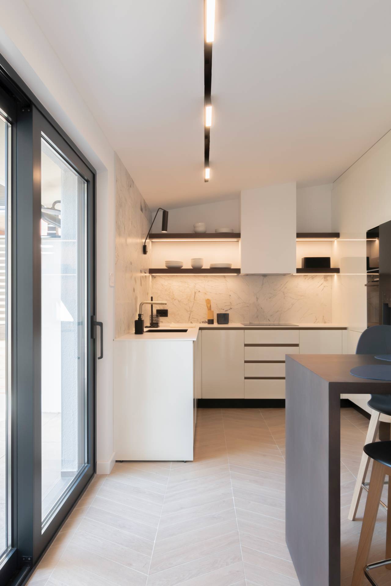 Kuhinja se odlikuje velikim kliznim vratima koja vode na terasu, predstavljajući značajnu promenu u odnosu na originalni dizajn. Svetao dizajn sa dinamičnim pločicama iznad radnih površina i bara daju dinamiku ovom prostoru.